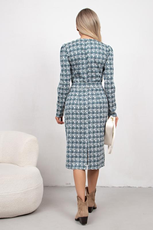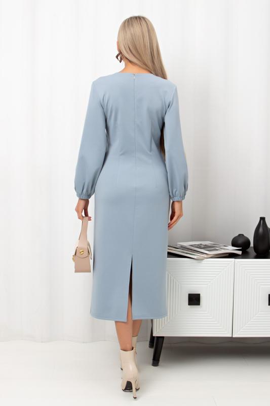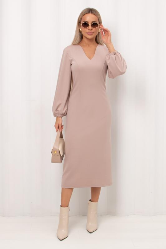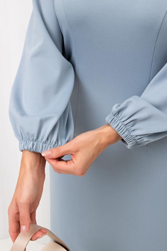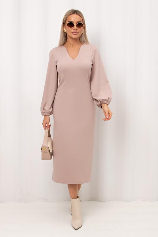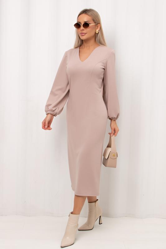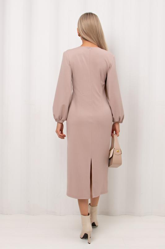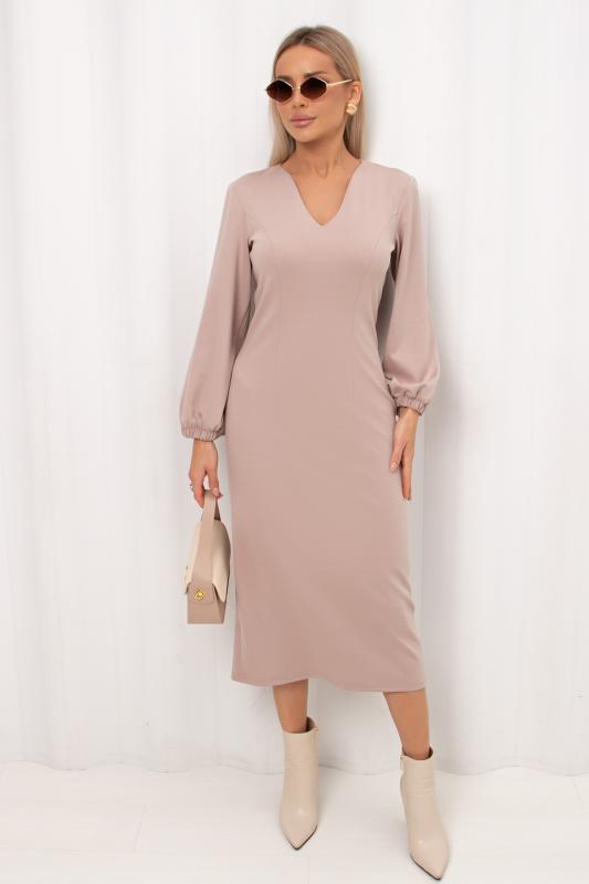 Женственное платье полуприлегающего силуэта изготовлено из трикотажного полотна. V-горловина на внутренней обтачке. Втачной рукав длиной 7-8 по низу присобран на резинку. По среднему шву спинки застежка на потайную молнию. Низ ровный, сзади разрез. Рекомендуемая стирка при t не более 30°.