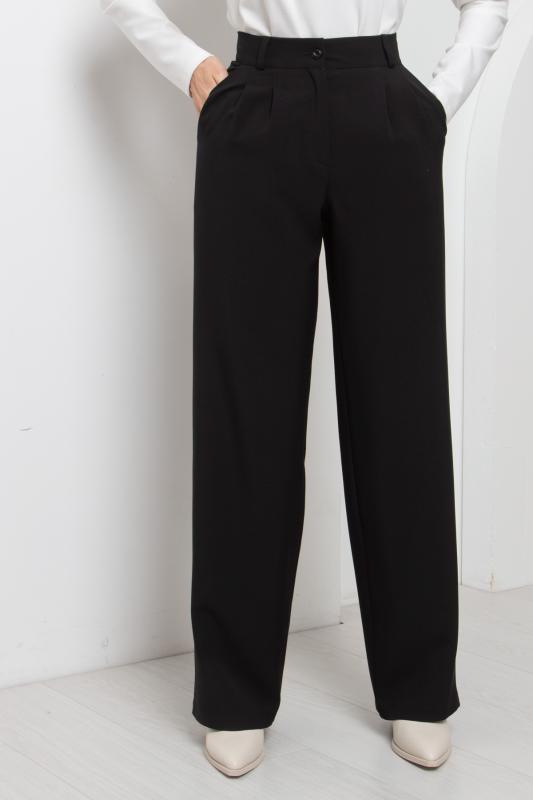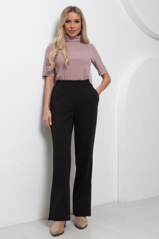 Стильные брюки прямого кроя с высокой посадкой на талии. Верх оформлен притачным поясом со шлевками под ремень и резинкой по спинке. Застежка на пуговицу и молнию оформлена гульфиком. Модель имеет функциональные карманы в боковых швах.