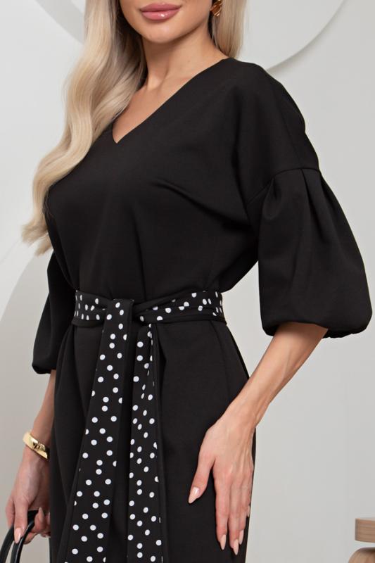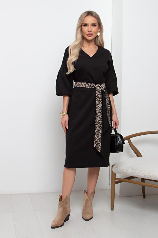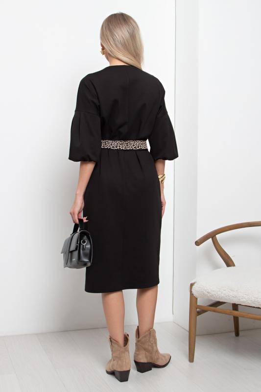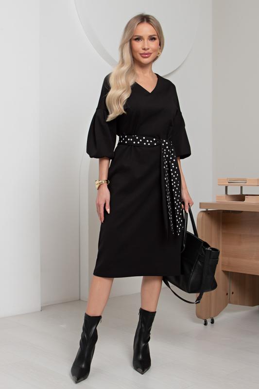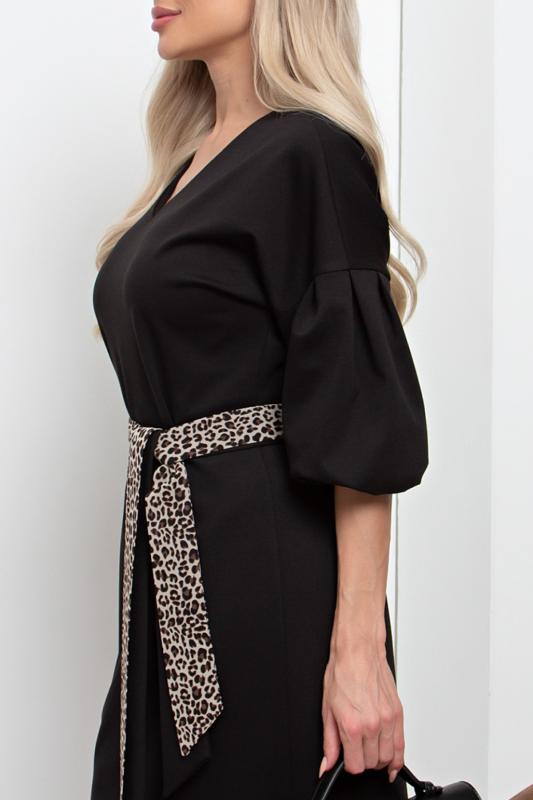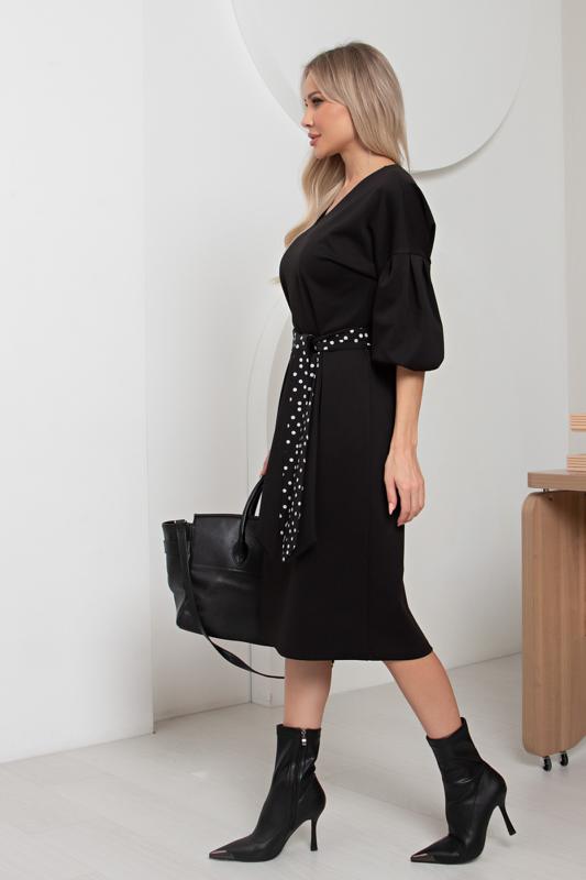 Женственное платье прямого силуэта. V - образная горловина на внутренней обтачке оформлена вставкой. Втачной рукав - фонарик со спущенным плечом. Низ ровный, оформлен притачной манжетой, сзади шлица. Пояс из основного материала входит в комплект.