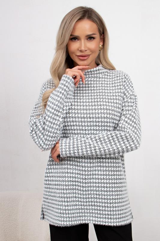 Джемпер из теплого трикотажного полотна свободного кроя. Длинный рукав со спущенным плечом. Воротник стойка. Низ ровный, имеются разрезы в боковых швах.