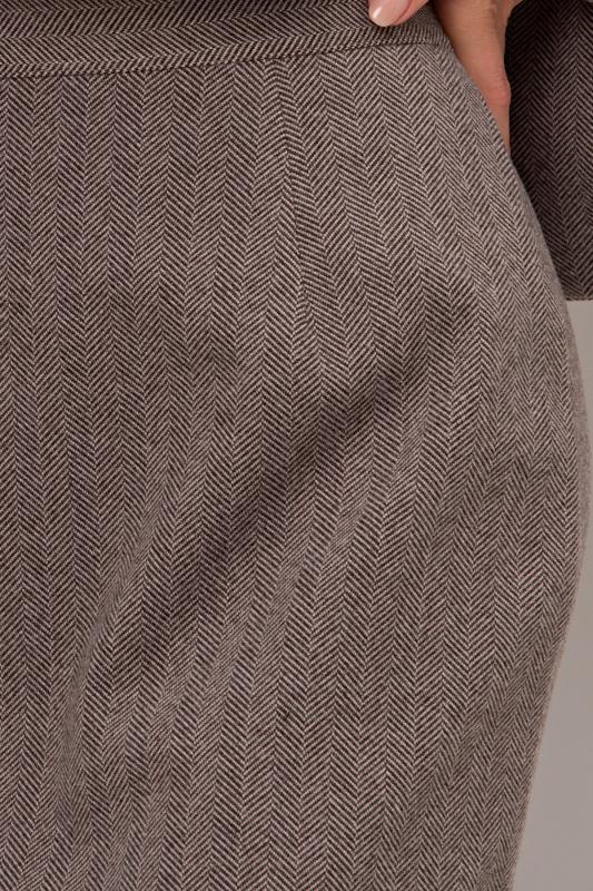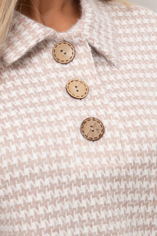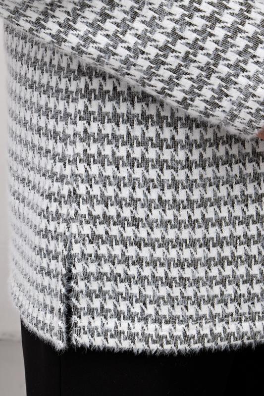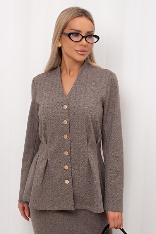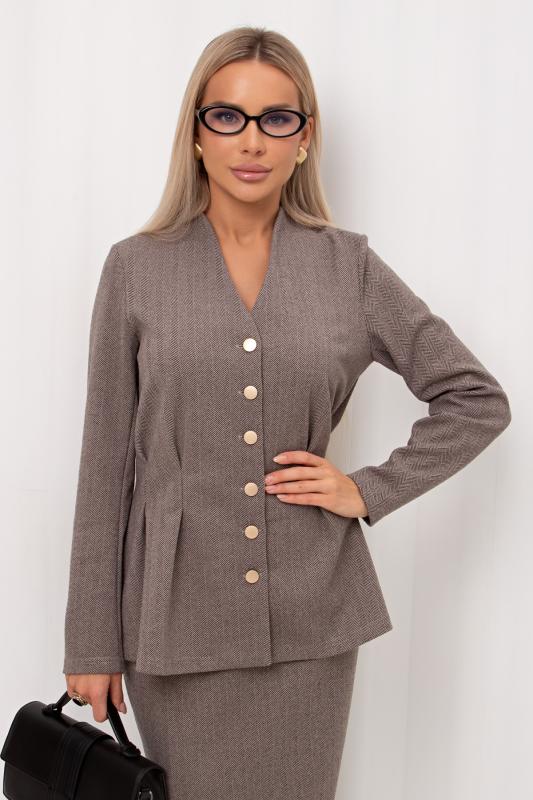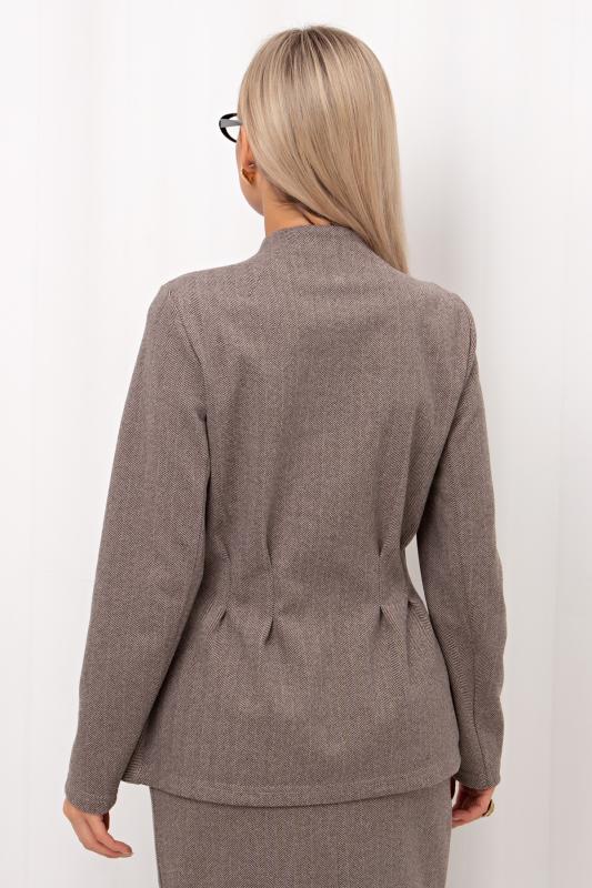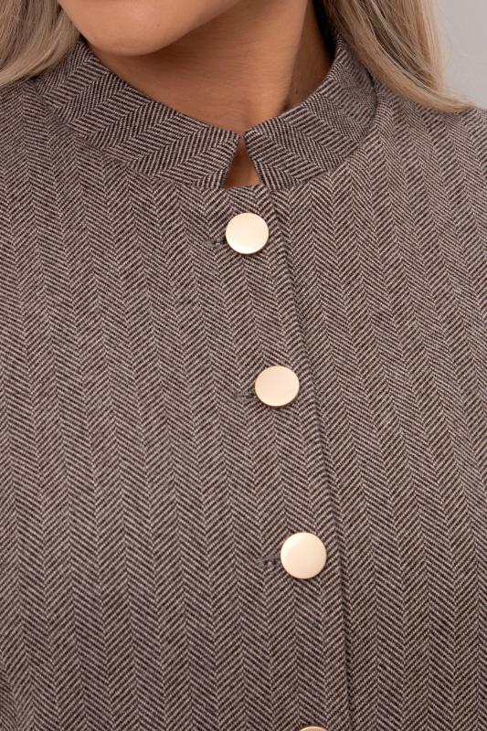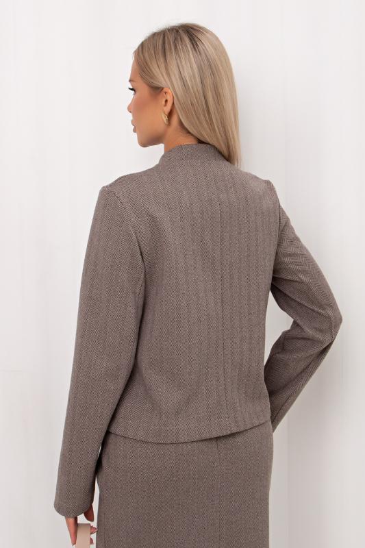 Стильный укороченный жакет прямого кроя из утепленного костюмного трикотажа в «ёлочку». Длинный втачной рукав. Горловина оформлена воротником-стойка. По центру переда застежка на петли и пуговицы.