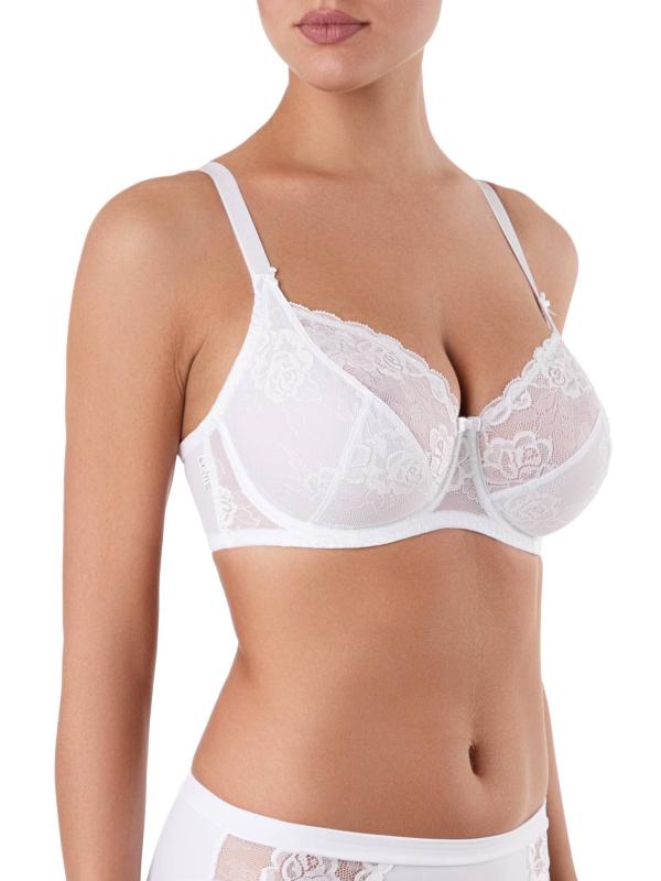 Бюстгальтер женский. Бюстгальтер с мягкой чашечкой с тройным диагональным членением, на каркасах. Чашка из неэластичного кружева и кружевного полотна на подкладке из неэластичной сетки. Металлическая фурнитура. Отделка - аппликация с логотипом Conte и бантики.