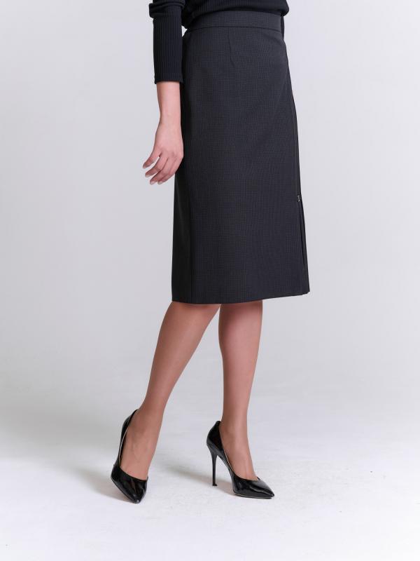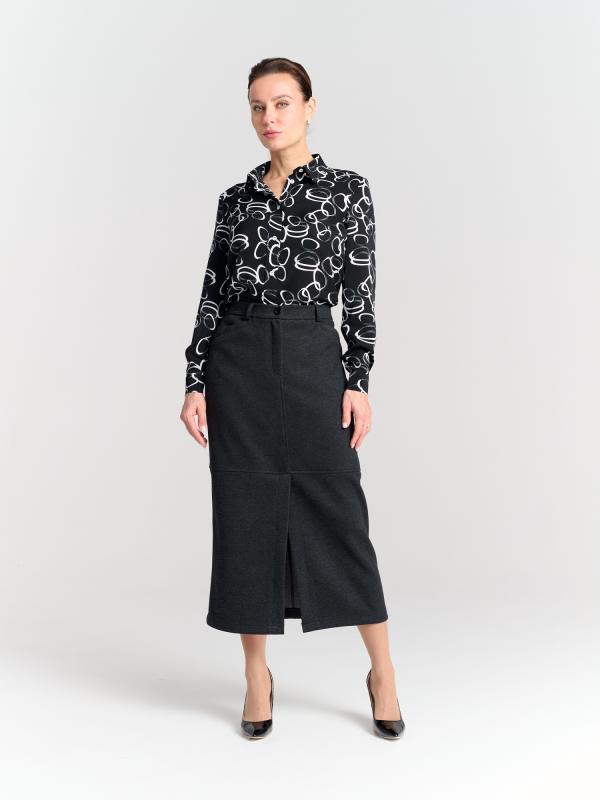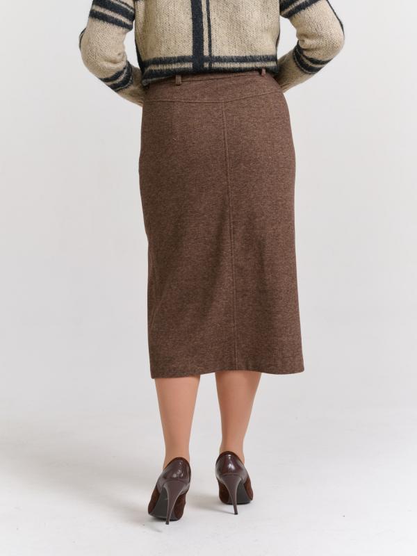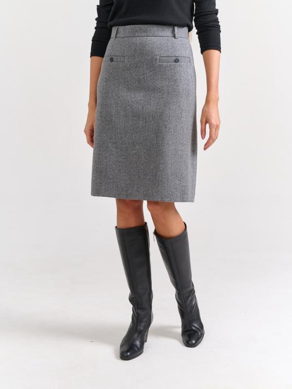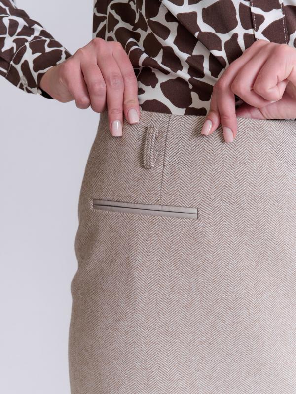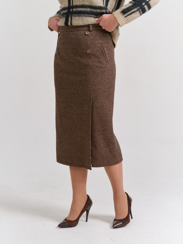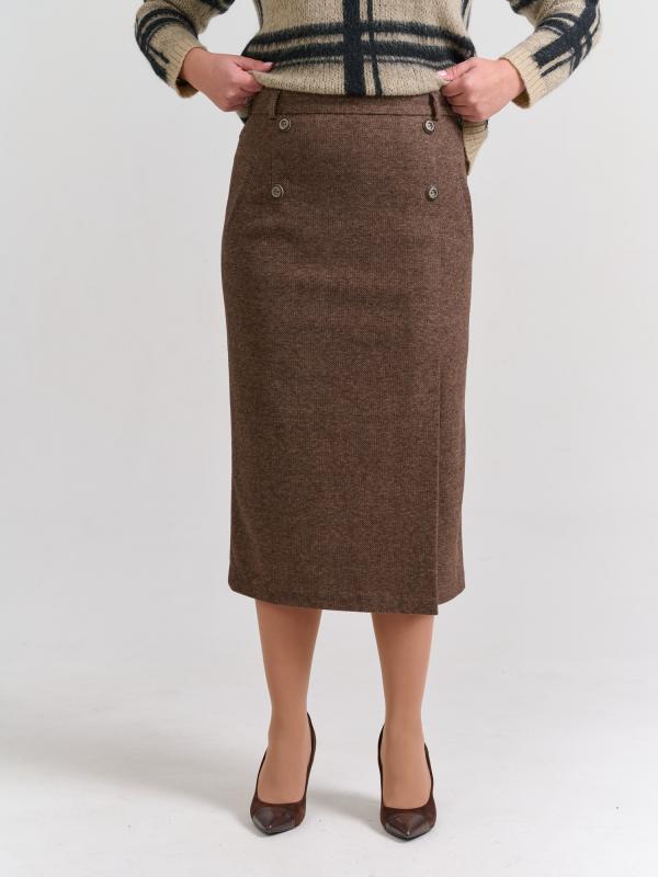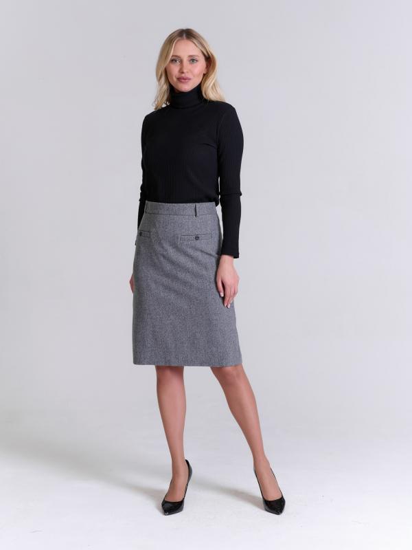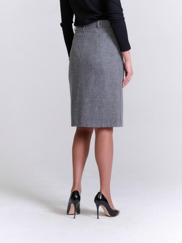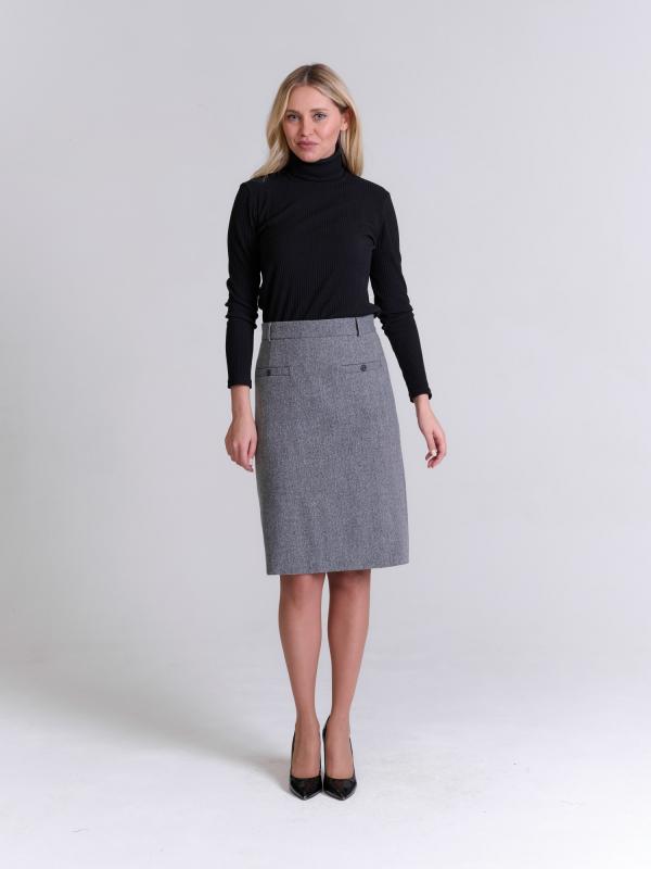 Женская теплая юбка прямого силуэта, на подкладке, с притачным поясом на шлевках, сзади по центу резинка. Застежка расположена по левому боковому шву на потайную тесьму молнию и закрепляется пуговицей. По бокам полноценные функциональные и очень удобные карманы, спереди по ноге шлица.