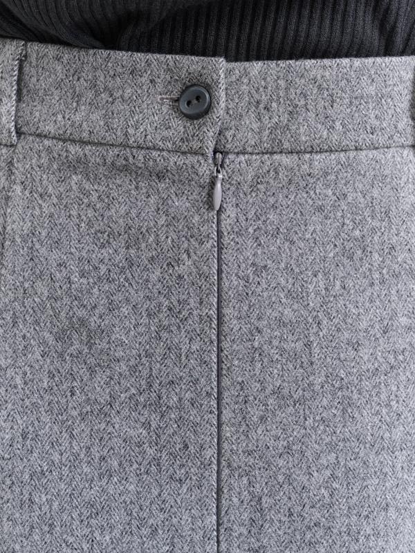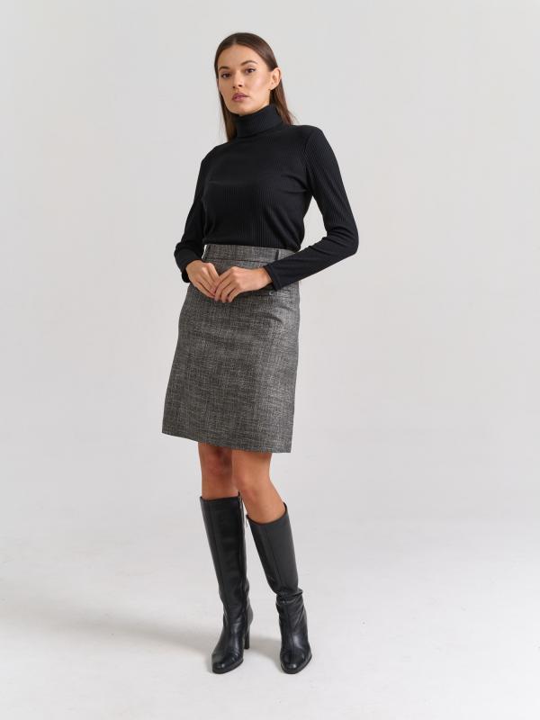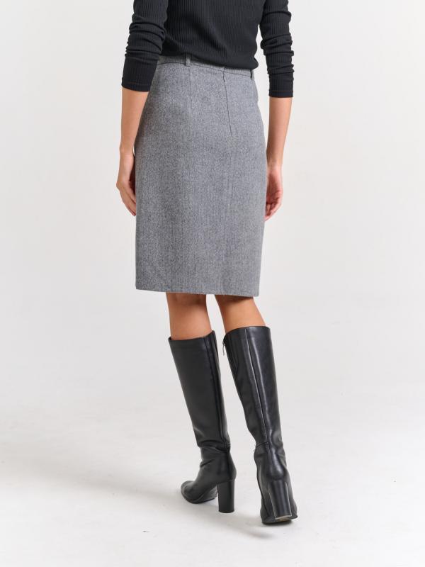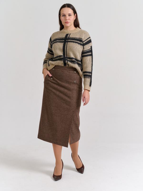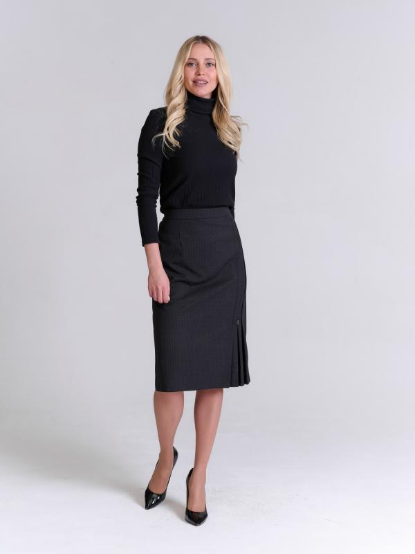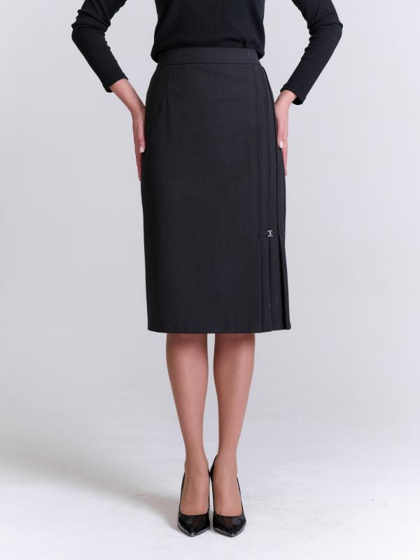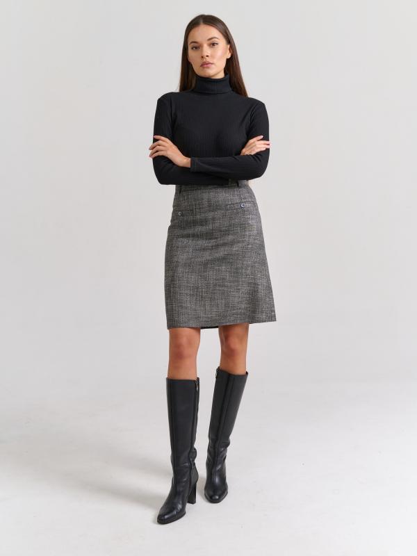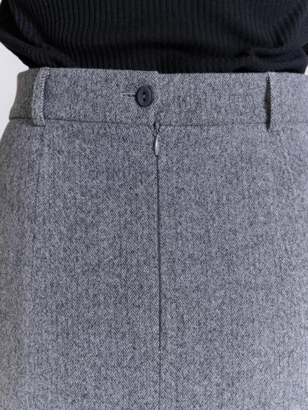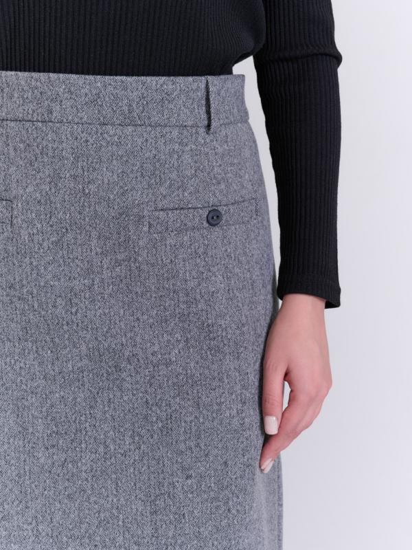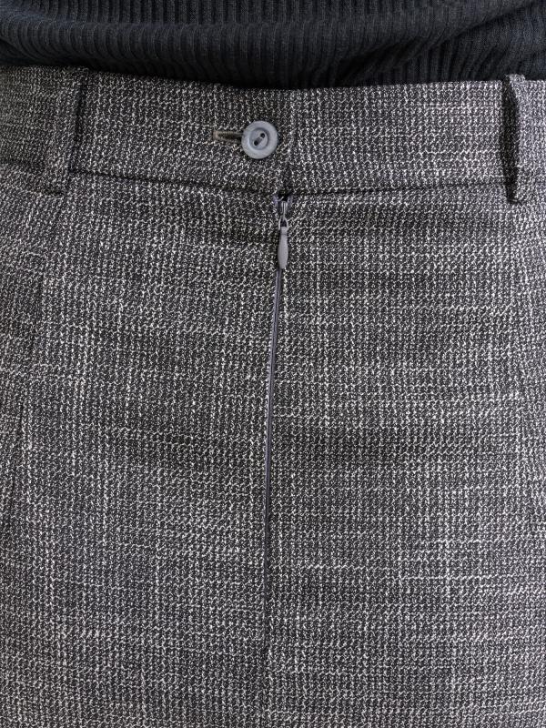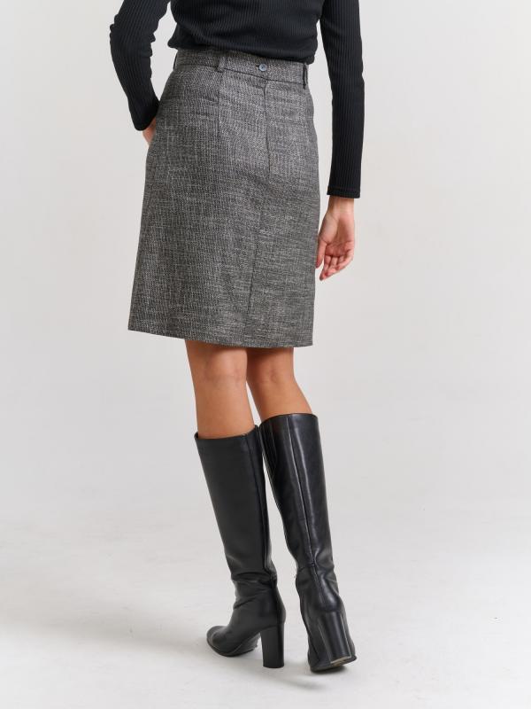 Женская теплая юбка прямого силуэта, на подкладке, с притачным поясом на шлевках, сзади по центу резинка. Застежка расположена по левому боковому шву на потайную тесьму молнию и закрепляется пуговицей. По бокам полноценные функциональные и очень удобные карманы, спереди по ноге шлица.