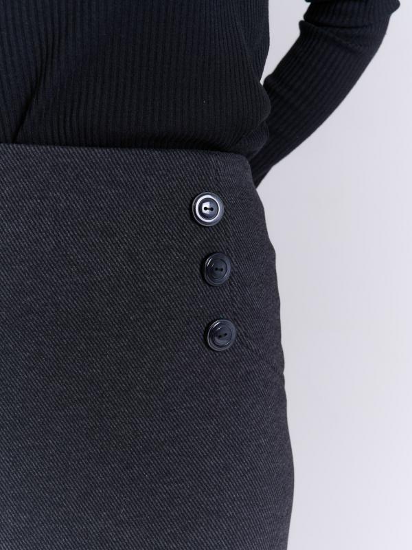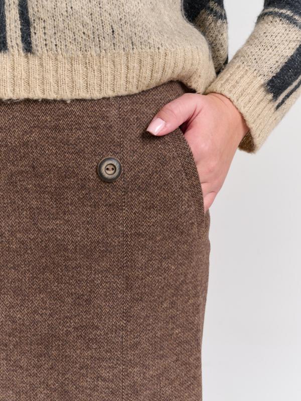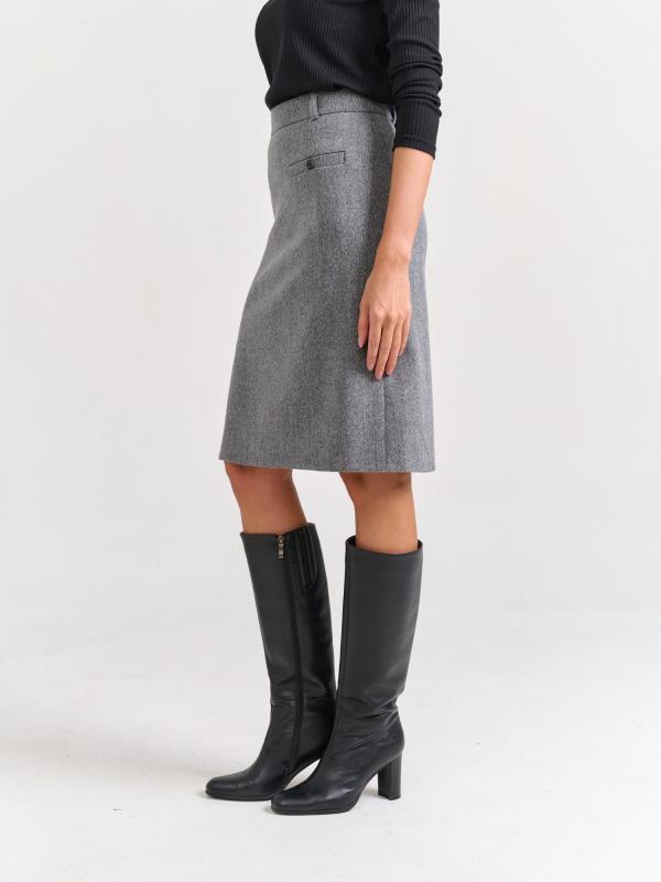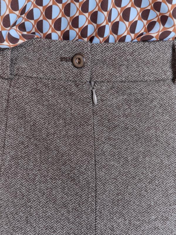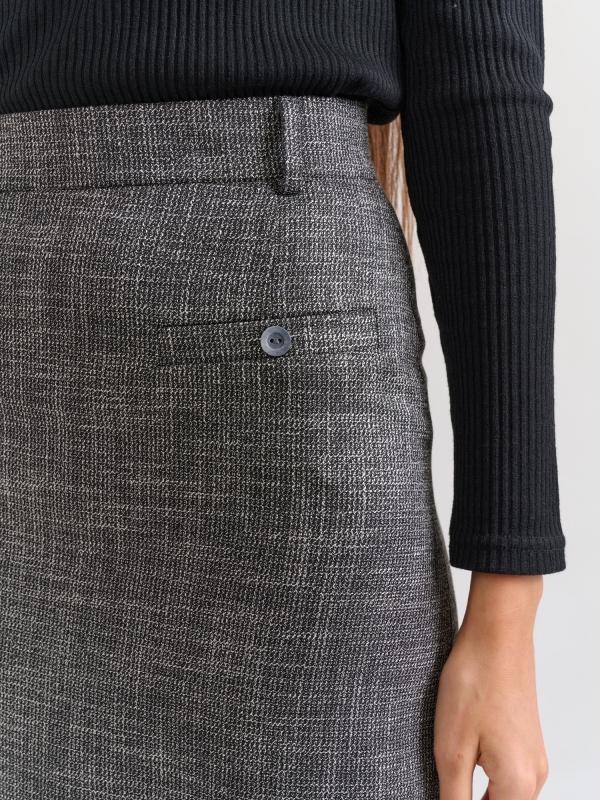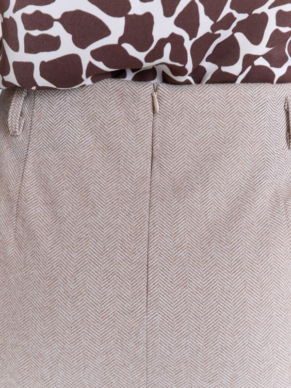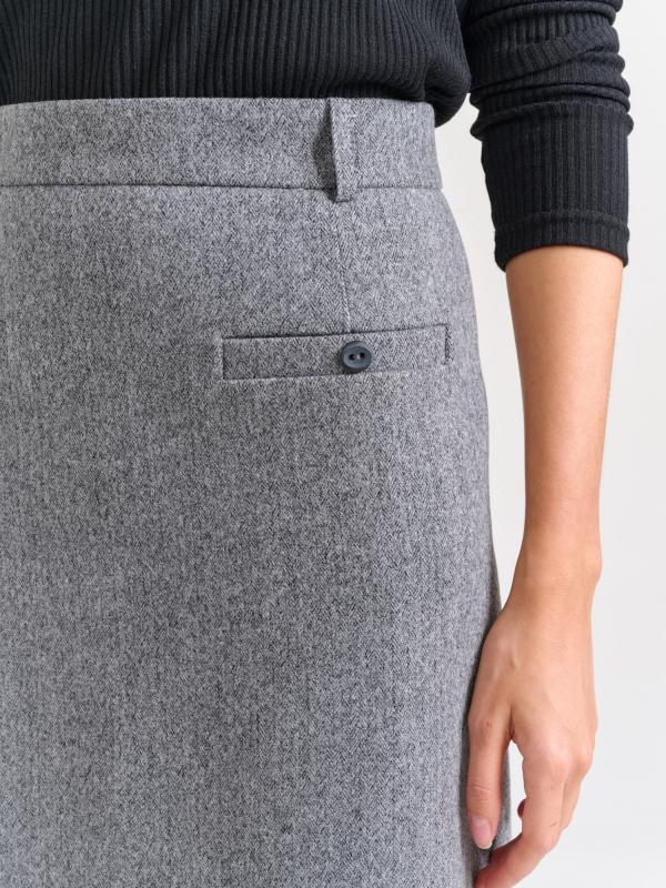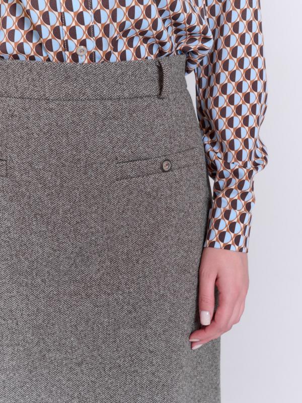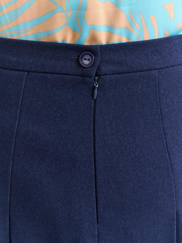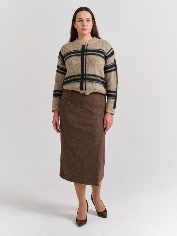 Женская теплая юбка прямого силуэта, на подкладке, с притачным поясом на шлевках, сзади по центу резинка. Застежка расположена по левому боковому шву на потайную тесьму молнию и закрепляется пуговицей. По бокам полноценные функциональные и очень удобные карманы, спереди по ноге шлица.