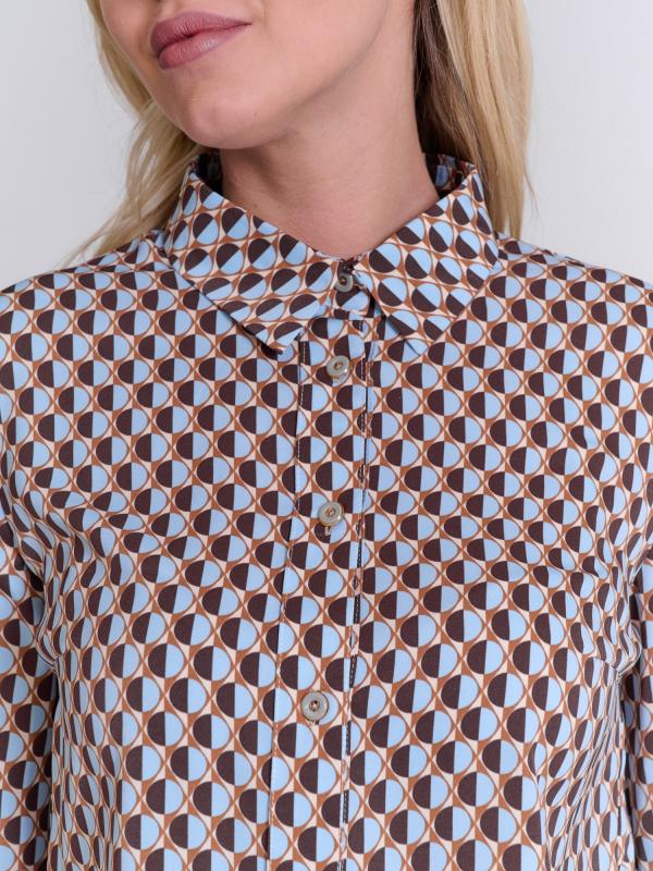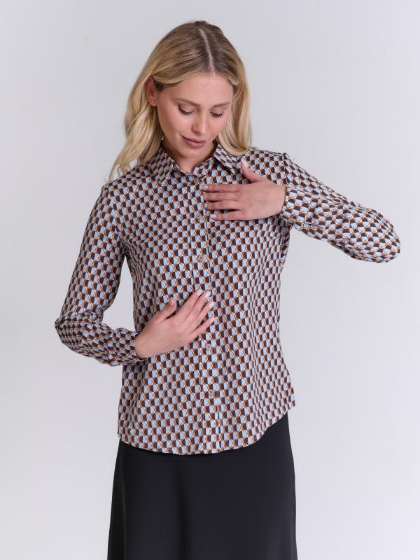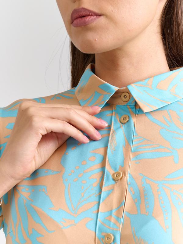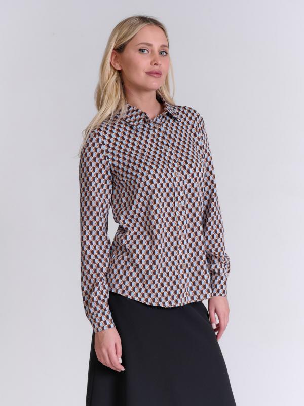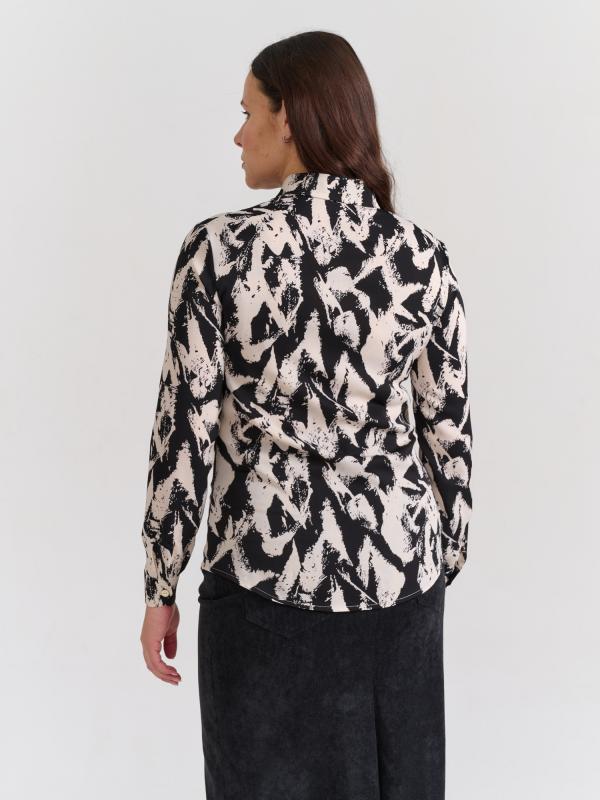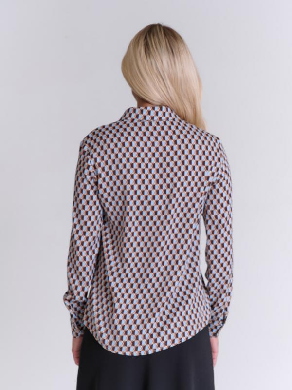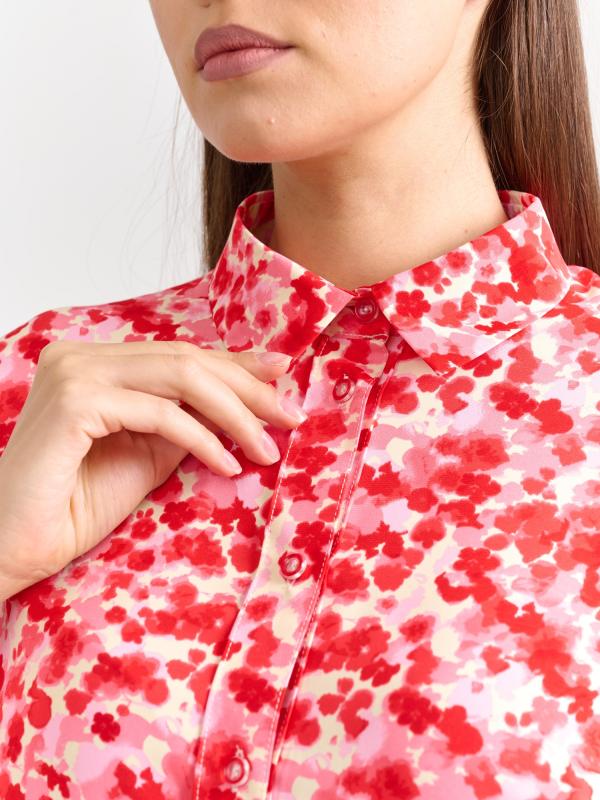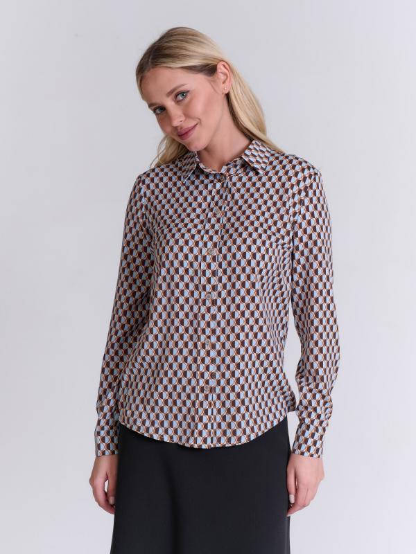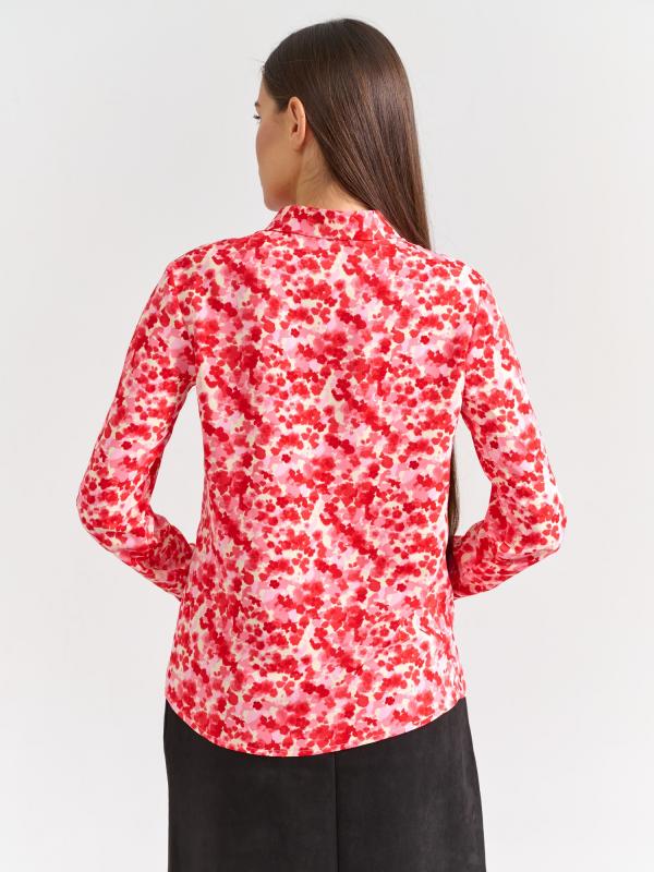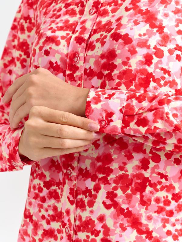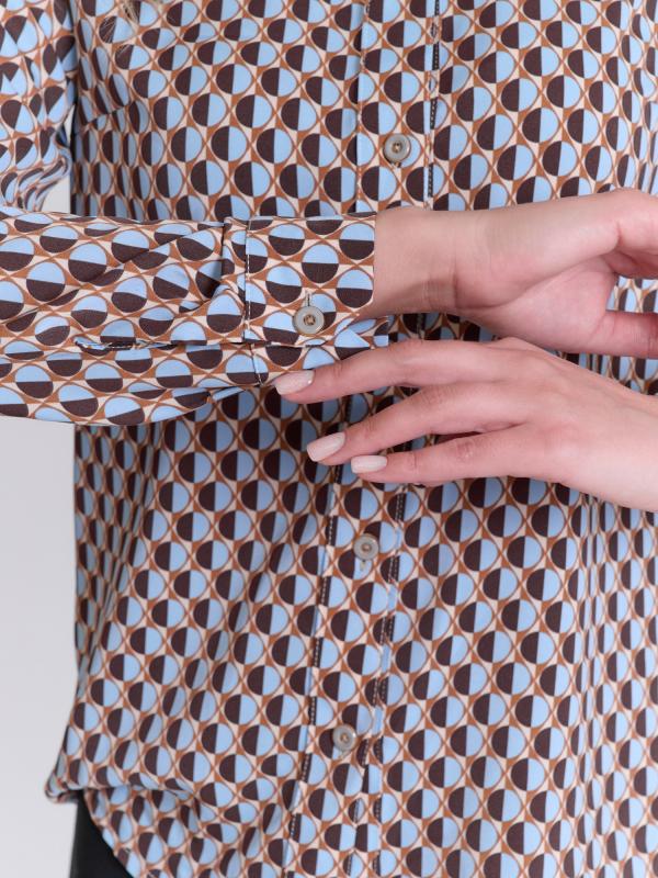Женская рубашка с длинным рукавом приталенного силуэта. Застежка расположена спереди и закрепляется на пуговицы. Рукав данной модели на манжете и закреплен также пуговицей. Элегантная рубашка, прекрасно сочетается с брюками и юбками, любого формата - от классического офисного до повседневного.