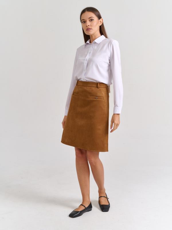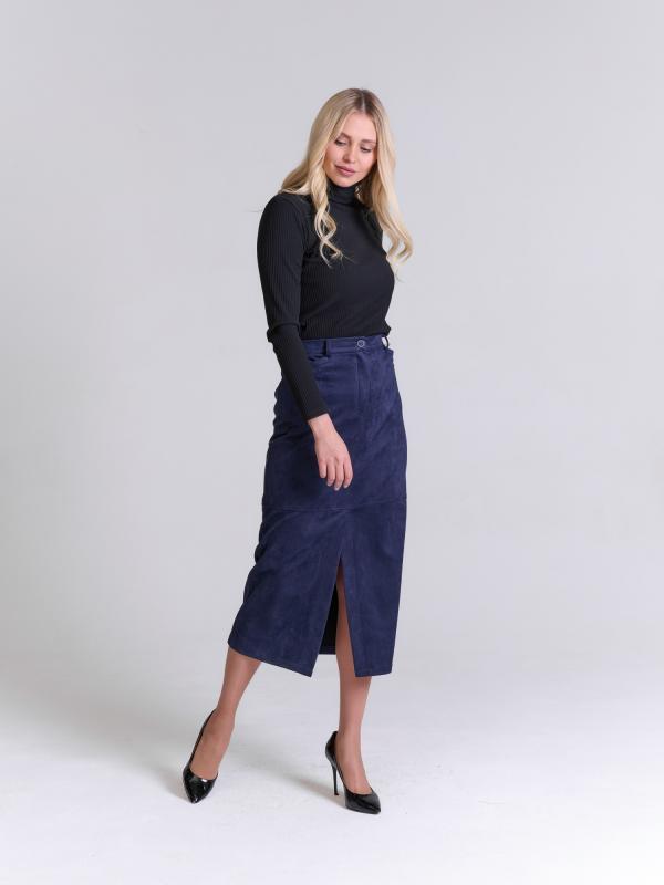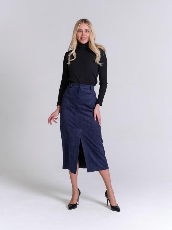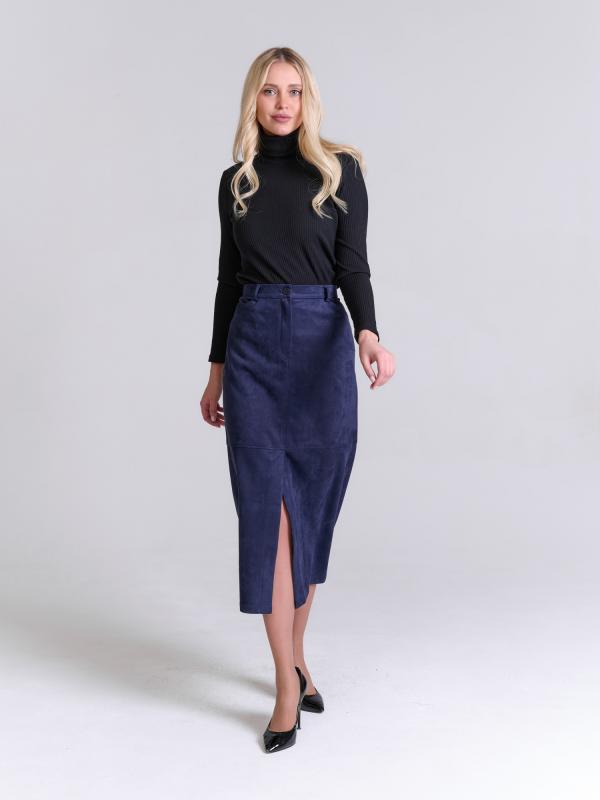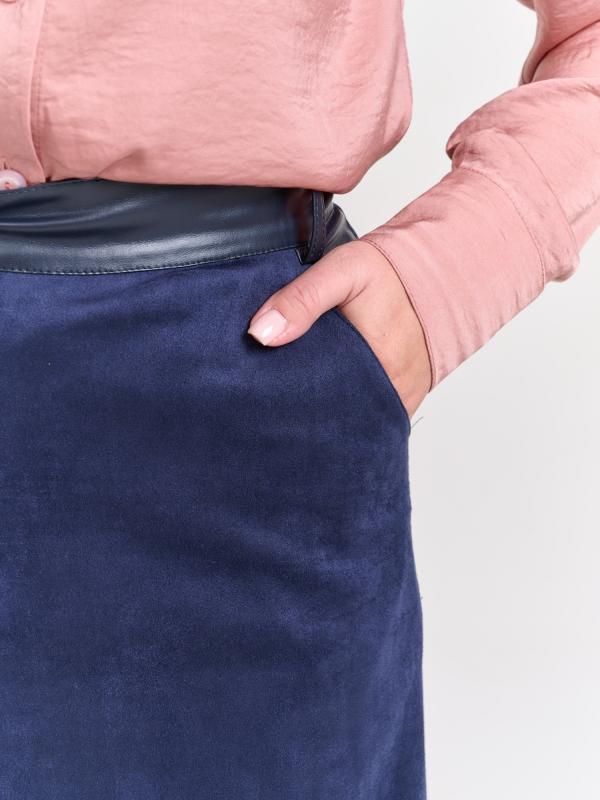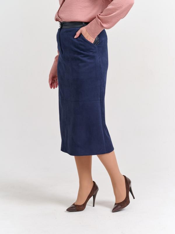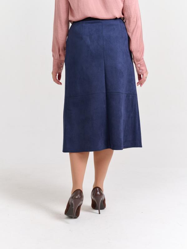 Женская юбка расклешенного силуэта на притачном поясе с подкладкой, выполнена из мягкой тактильной ткани имитирующей замшу с отделкой из искусственной кожи. Застежка расположена спереди по среднему шву на молнию и закрепляется пуговицей. Прекрасный вариант элегантной расцветки, с идеальной посадкой. По бокам функциональные карманы.
