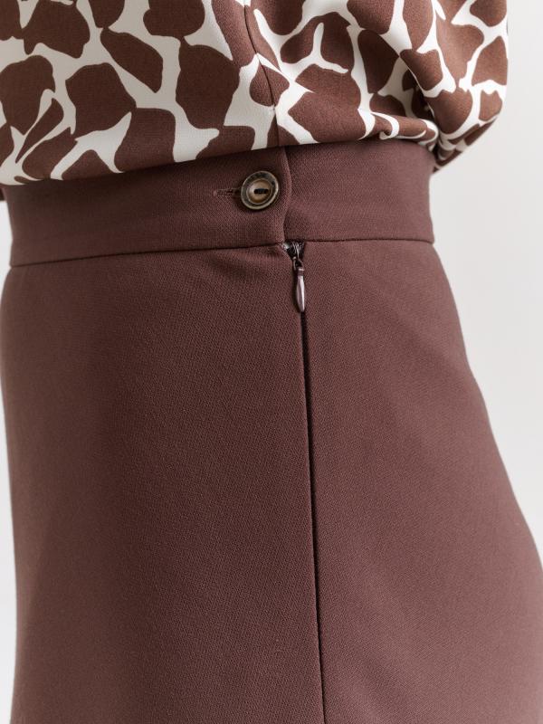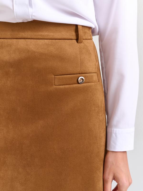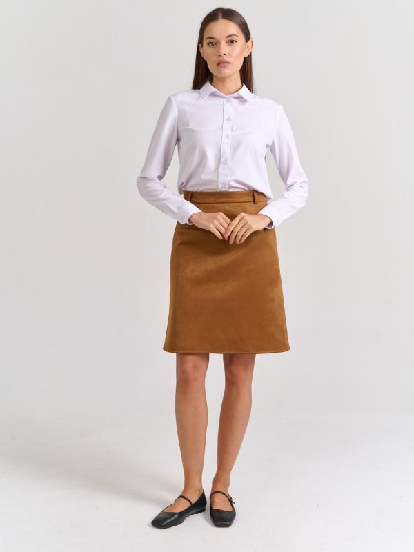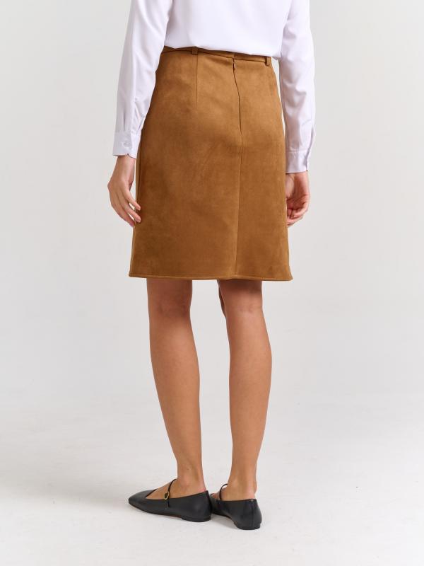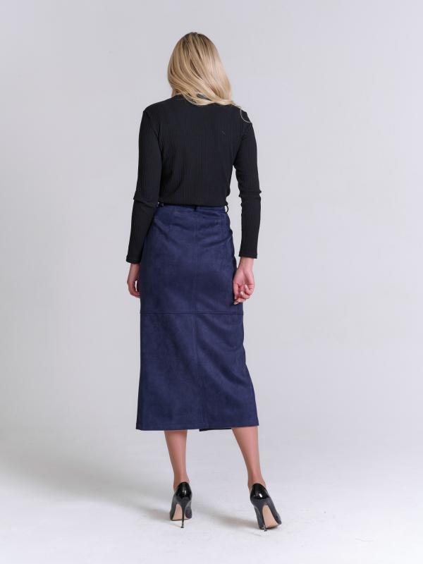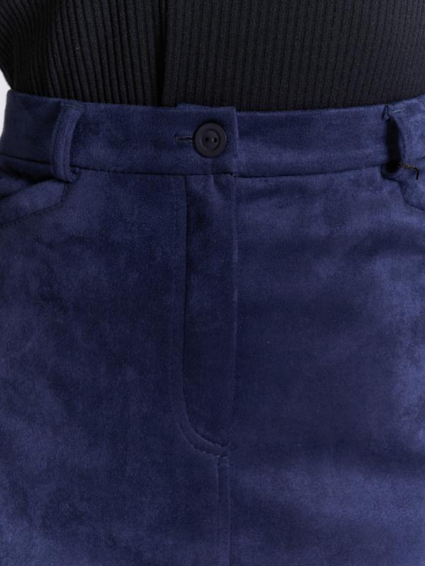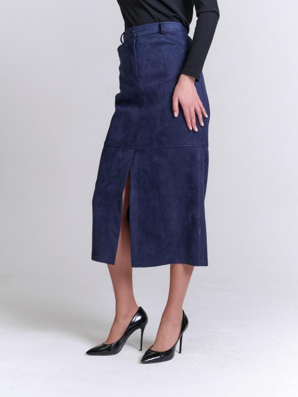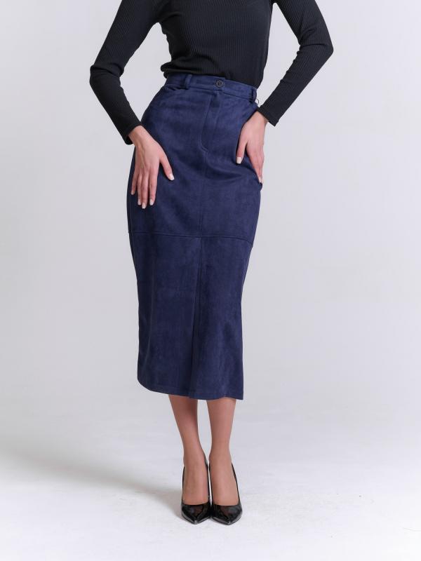 Женская юбка расклешенного силуэта на притачном поясе с подкладкой, выполнена из мягкой тактильной ткани имитирующей замшу с отделкой из искусственной кожи. Застежка расположена спереди по среднему шву на молнию и закрепляется пуговицей. Прекрасный вариант элегантной расцветки, с идеальной посадкой. По бокам функциональные карманы.