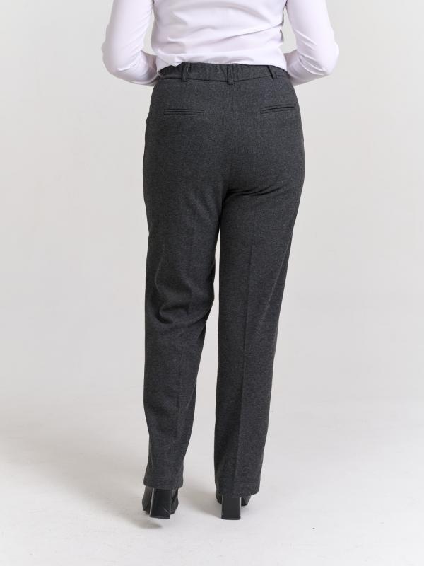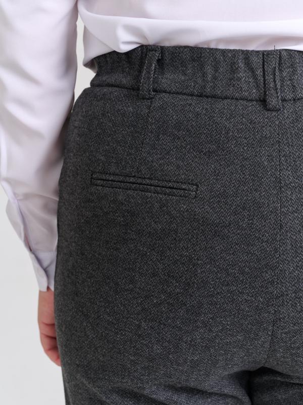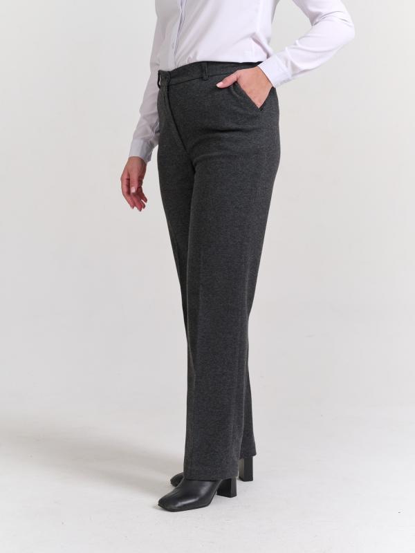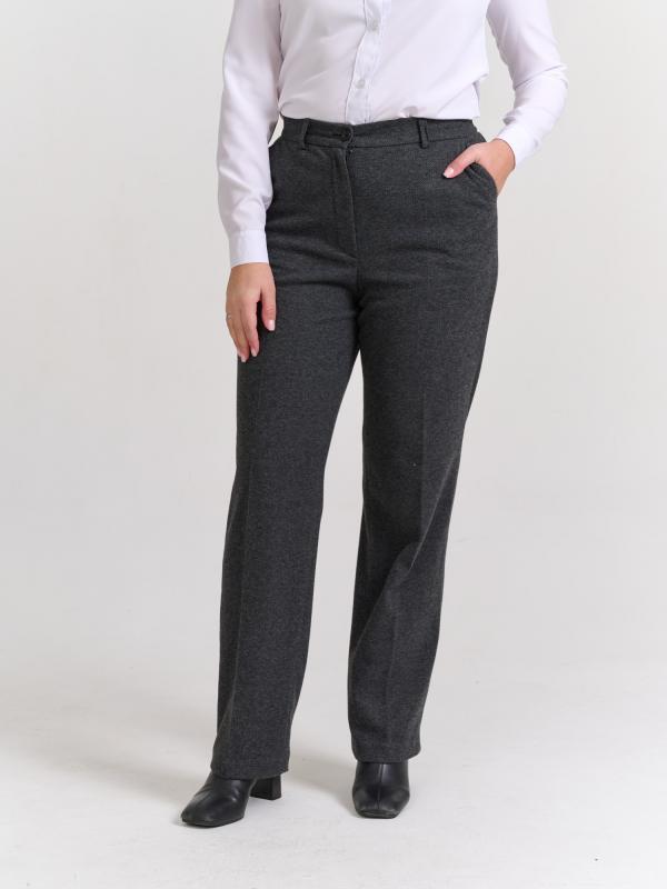 Женские теплые брюки прямого силуэта. Данная модель на притачном поясе со шлевками и резинкой по заду. Застежка расположена спереди на молнию и закрепляется пуговицей. Спереди по бокам присутствуют функциональные карманы, сзади декоративные в рамку.