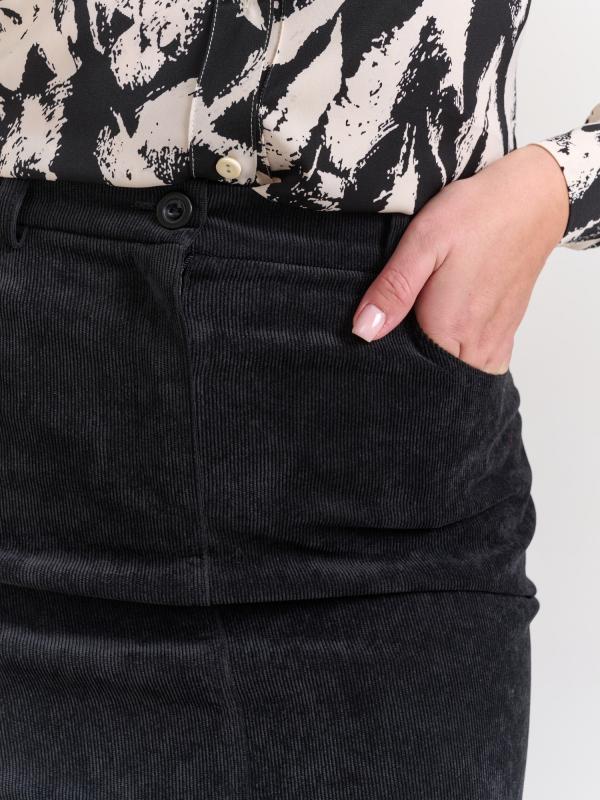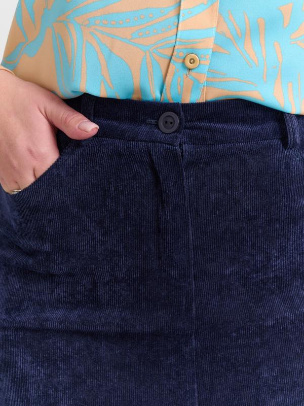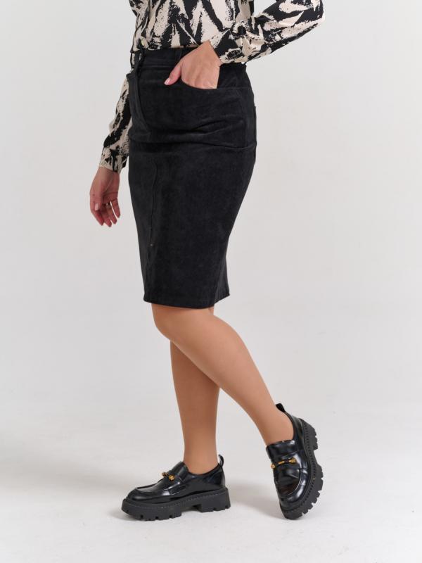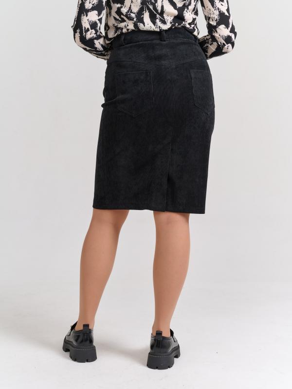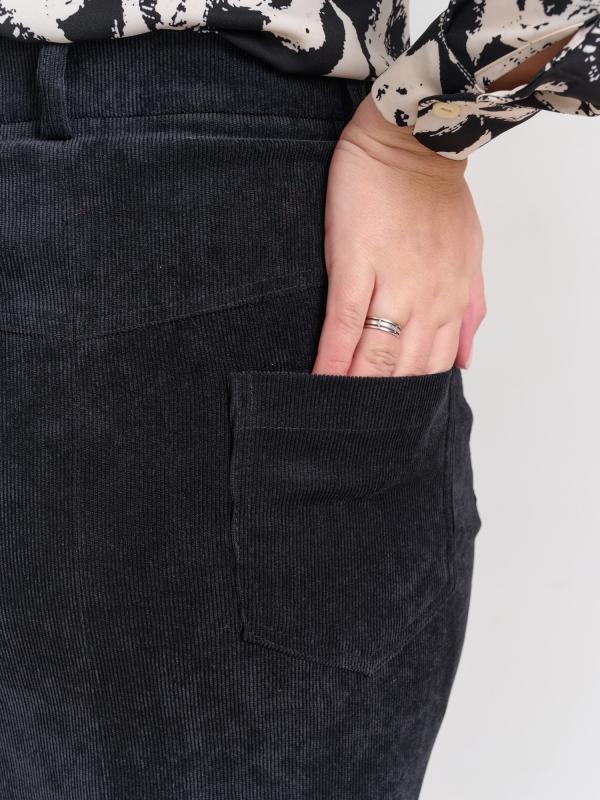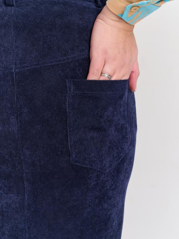 Женская вельветовая юбка прямого силуэта на подкладке с притачным поясом и шлевками. Застежка расположена спереди по среднему шву на молнию и закрепляется пуговицей. Прекрасный повседневный офисный вариант, с накладными карманами сзади и очень удобными функциональными карманами спереди.