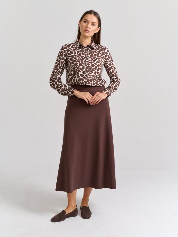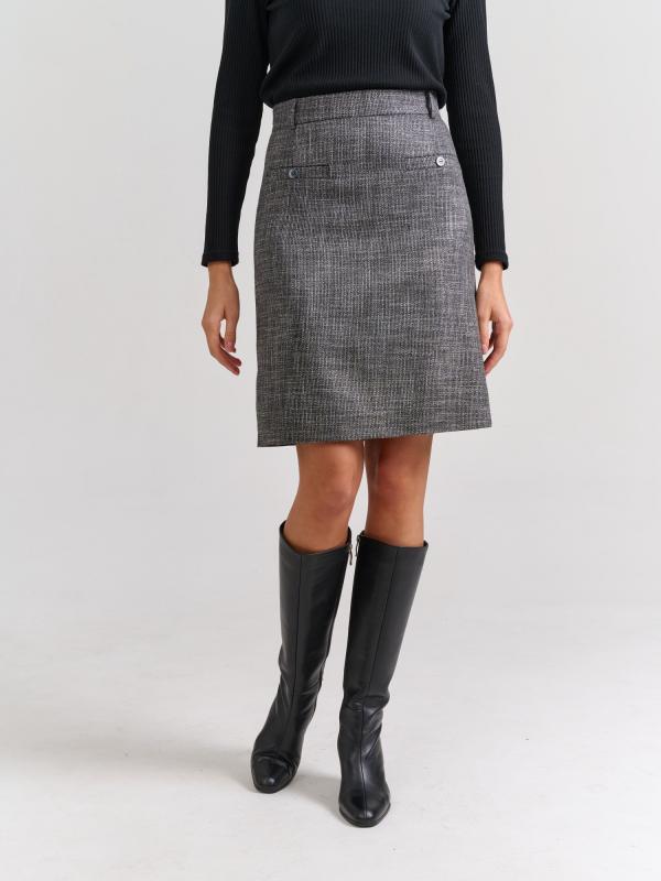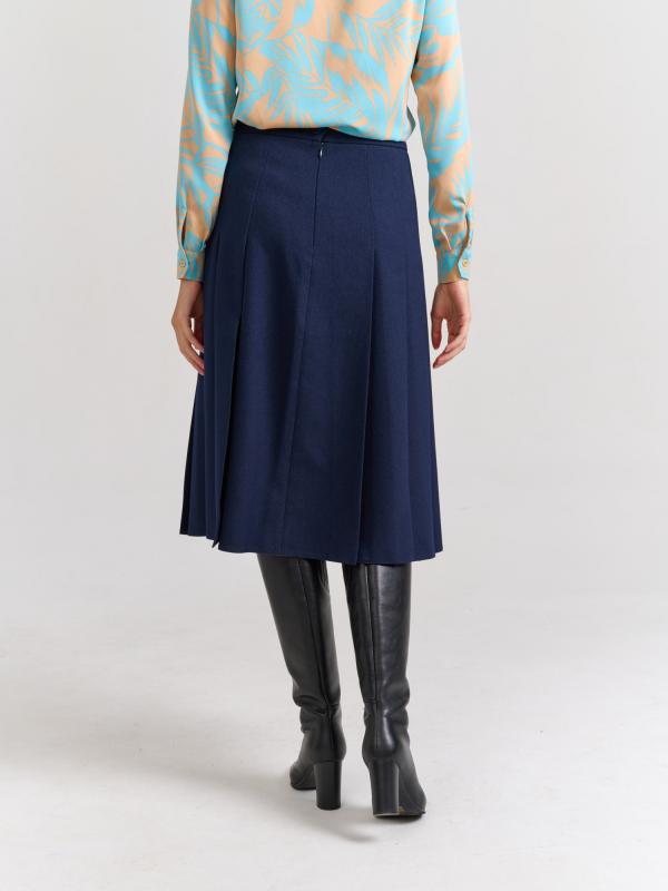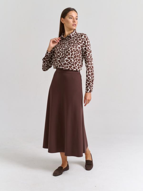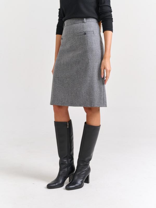 Женская юбка расклешенного силуэта на притачном поясе с подкладкой. Застежка расположена сзади по среднему шву на потайную тесьму молнию и закрепляется пуговицей. Прекрасный вариант из элегантной ткани, с идеальной посадкой. Спереди 2 декоративных кармана-листочки, закрепленные пуговицами.