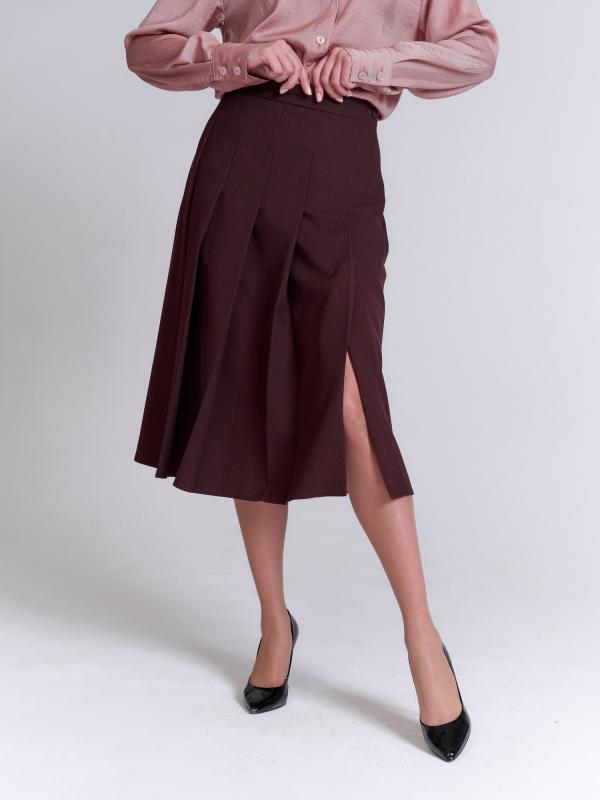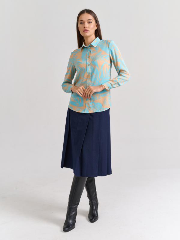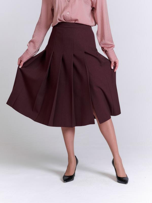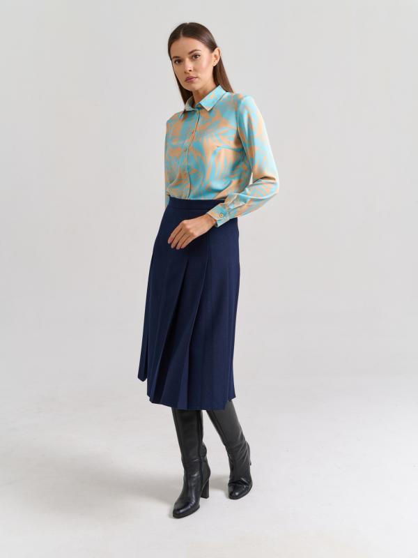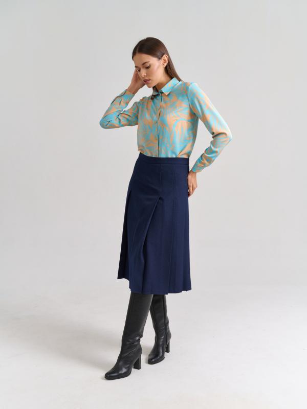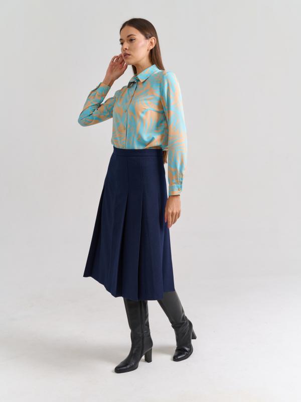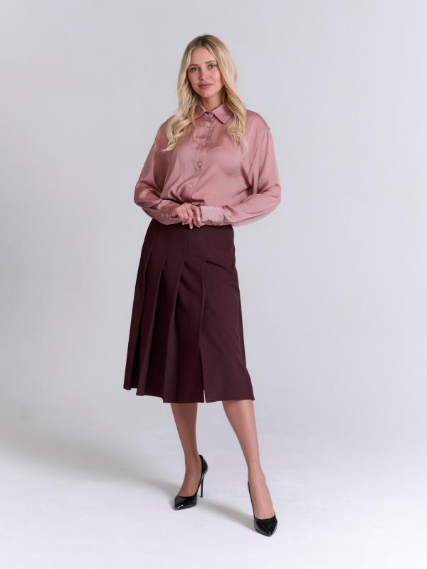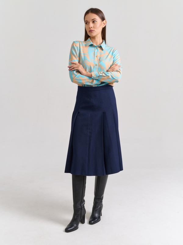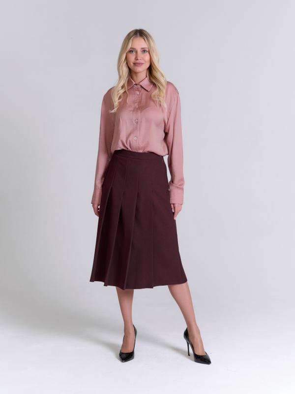 Женская юбка, расклешенная от пояса к низу, на подкладке, с притачным поясом, застежка расположена по боковому шву на молнию и закрепляется пуговицей. Расположенные по кругу, застроченные до уровня бедра складки, подчеркивают женственность фигуры на уровне талии и бедер, по левой ноге в складке расположена шлица.Рубашка арт.976-1138