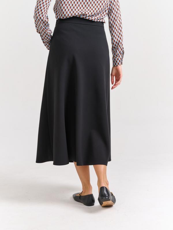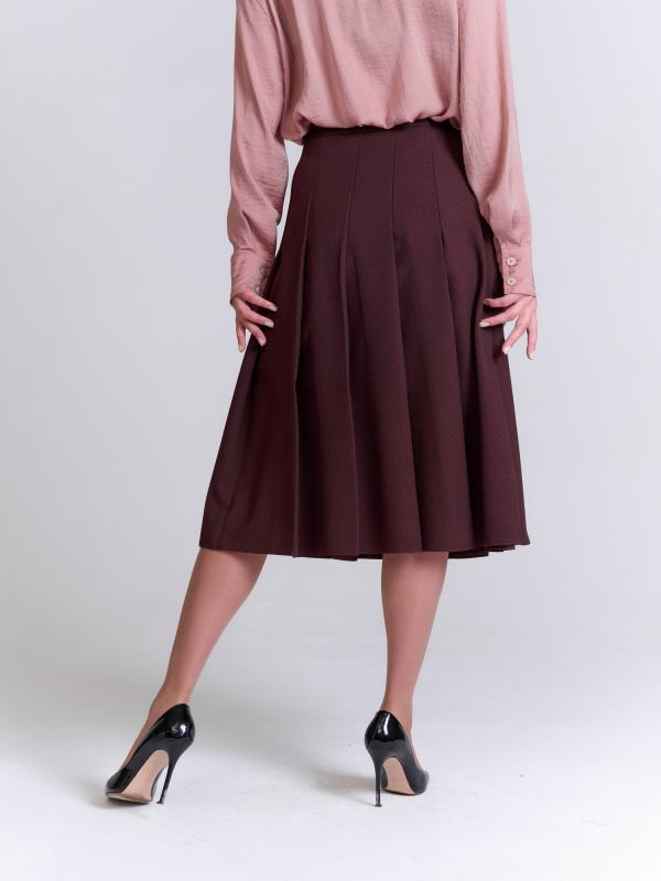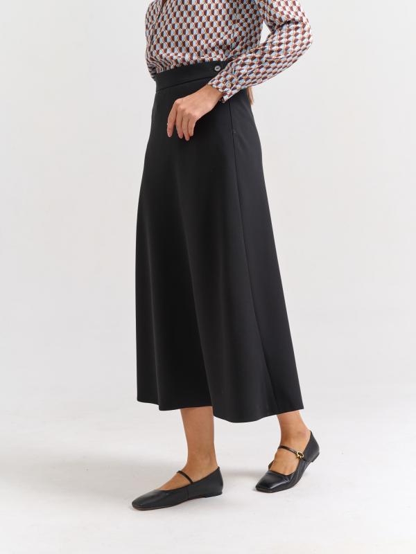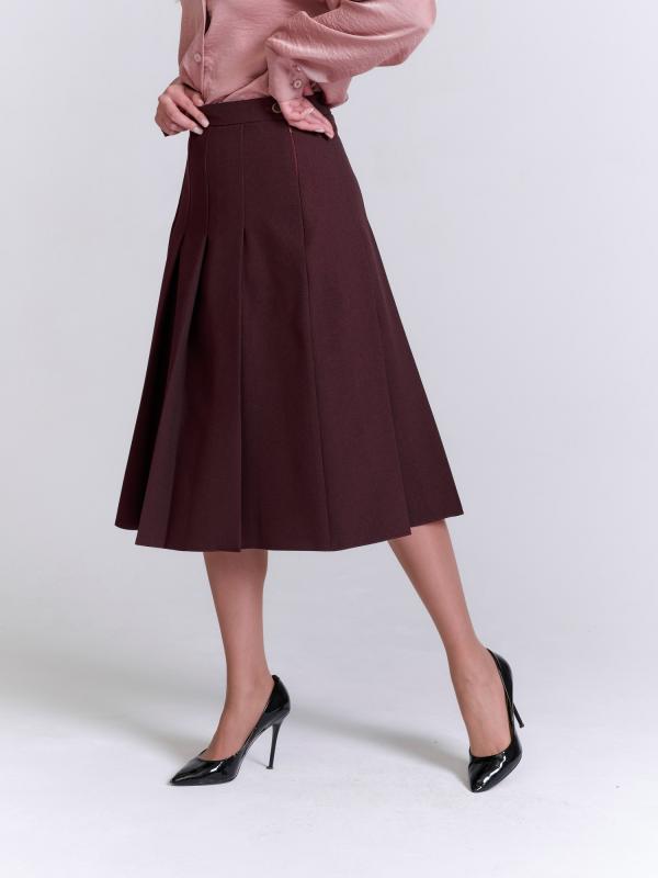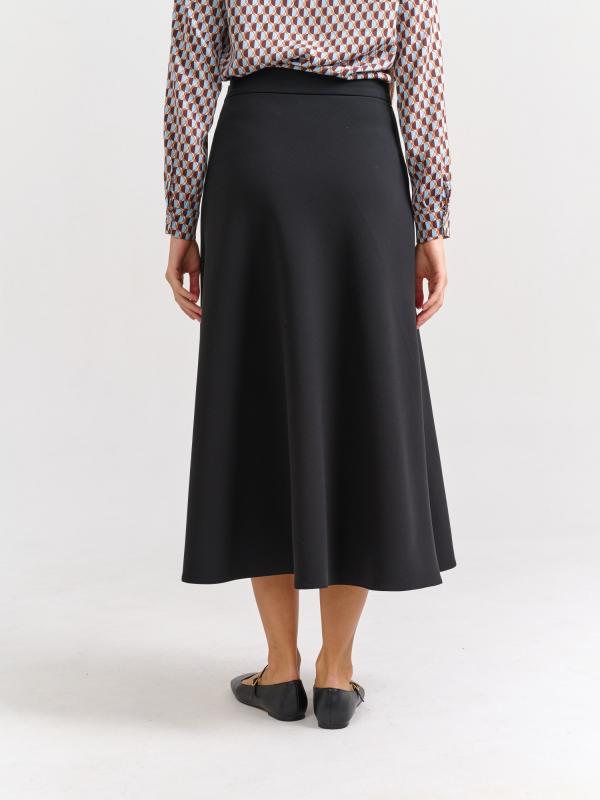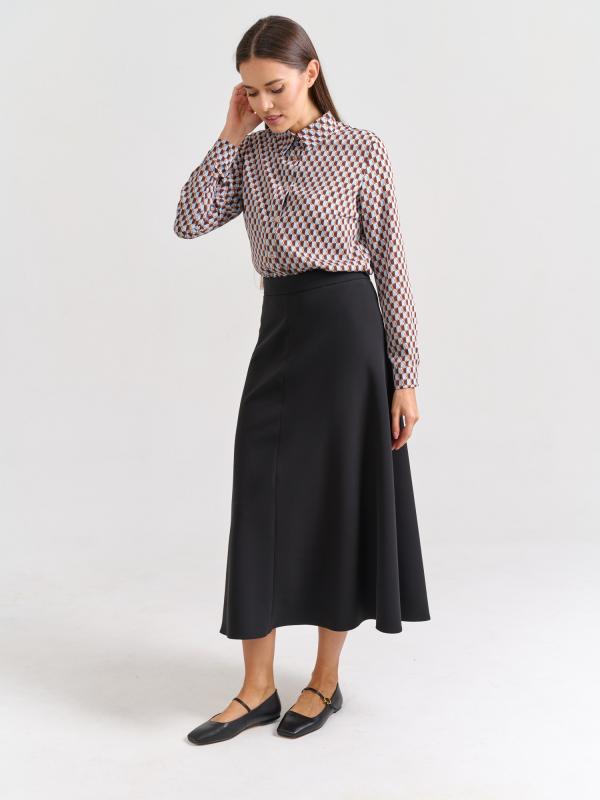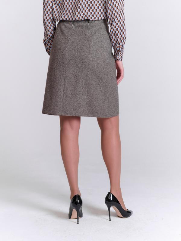Женская юбка, расклешенная от пояса к низу, на подкладке с притачным поясом. Застежка расположена слева по боковому шву на потайную тесьму молнию и закрепляется пуговицей.