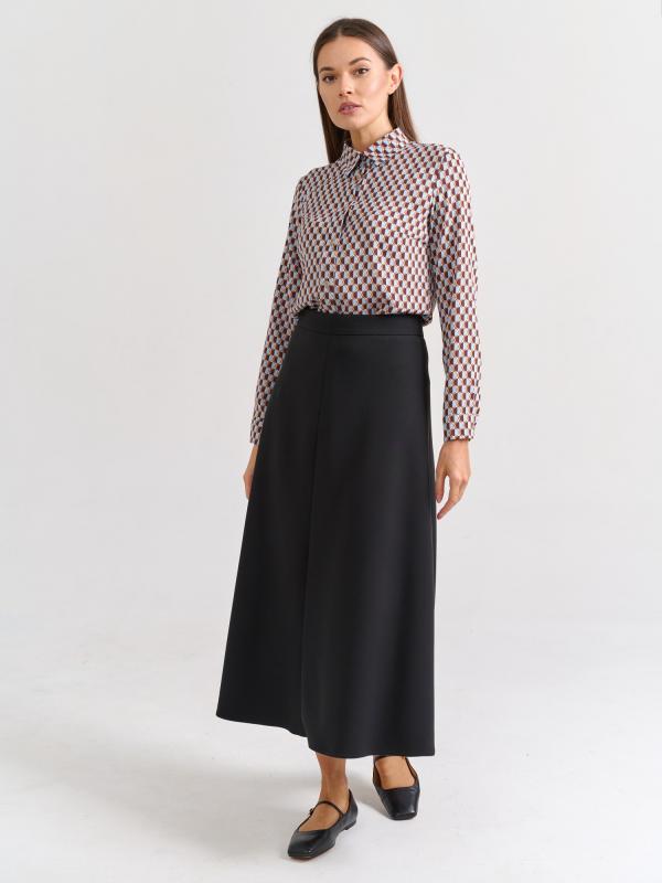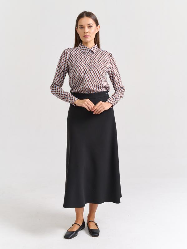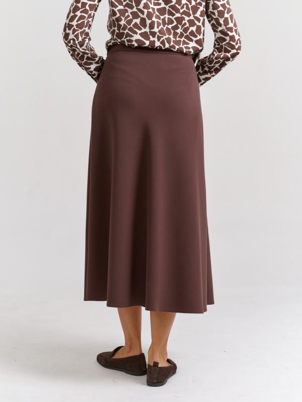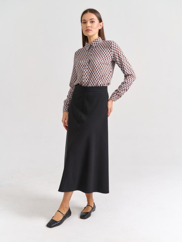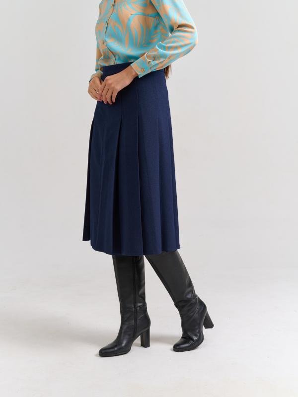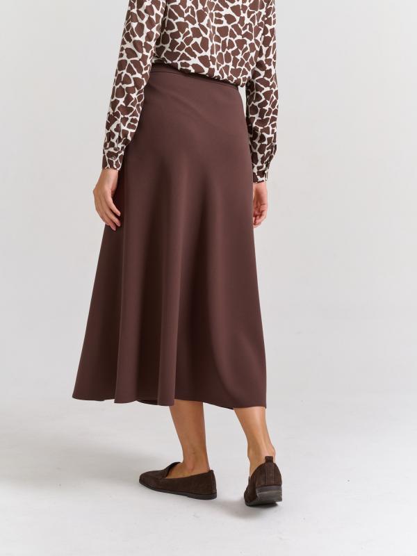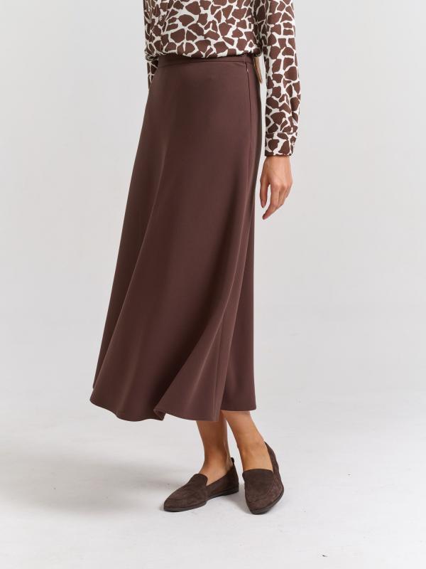 Женская юбка, расклешенная от пояса к низу, на подкладке с притачным поясом. Застежка расположена слева по боковому шву на потайную тесьму молнию и закрепляется пуговицей.