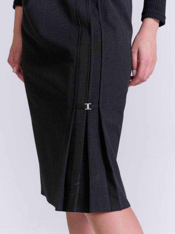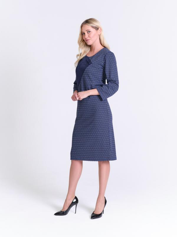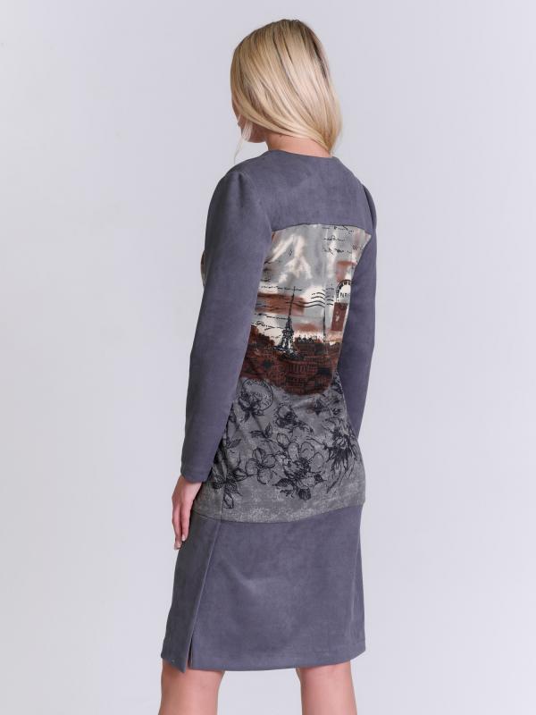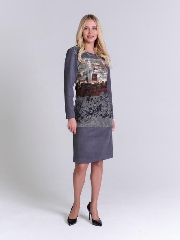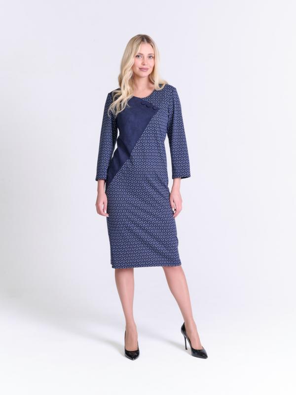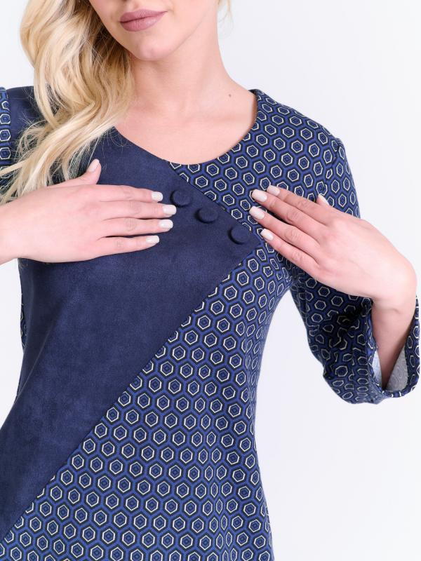 Женское платье с длинным рукавом, прямого силуэта, выполнено из трикотажного полотна в комбинации с искусственной замшей, декорировано по верху изделия пуговицами . Прекрасный повседневный офисный вариант.