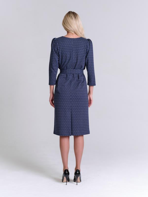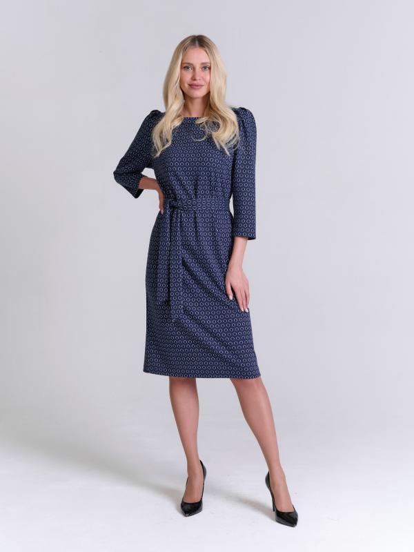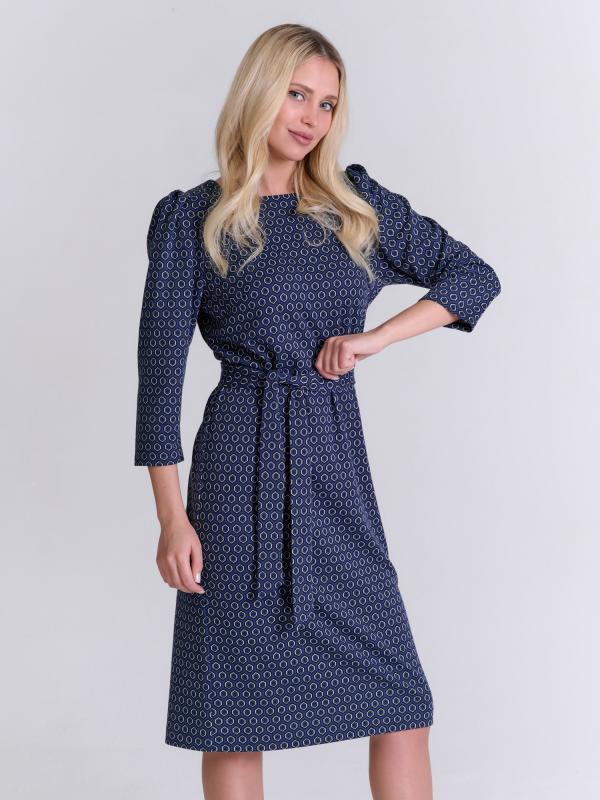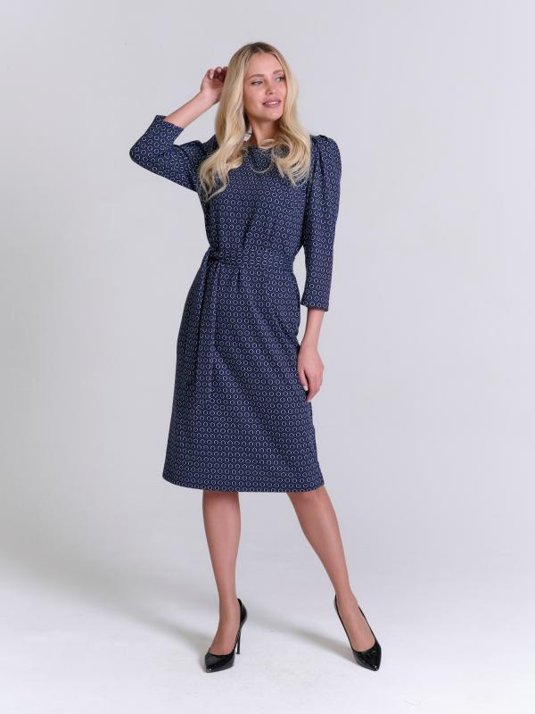 Женское платье с длинным рукавом, прямого силуэта, выполнено из трикотажного полотна по линии талии подчеркнуто поясом с пряжкой. Прекрасный повседневный офисный вариант.