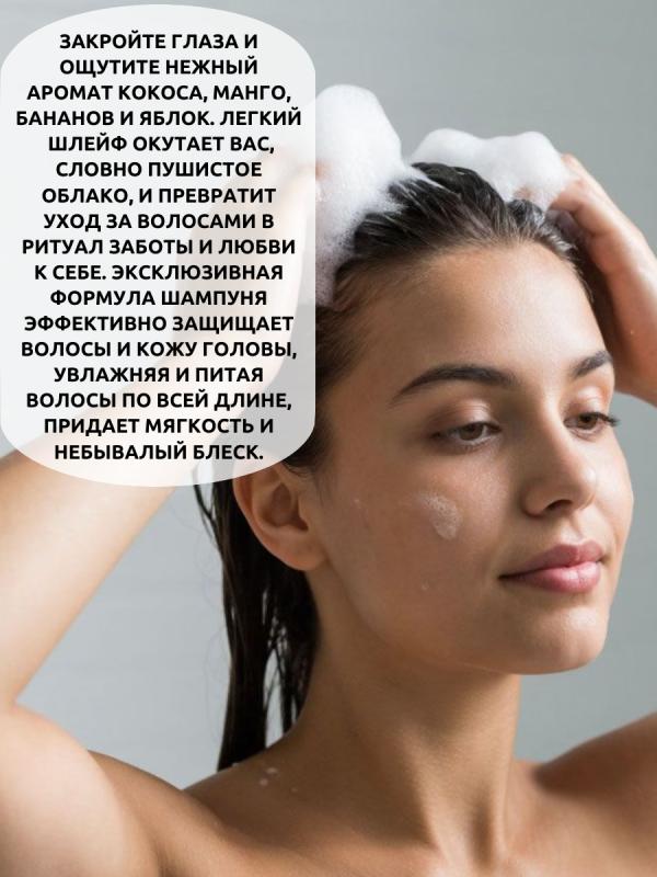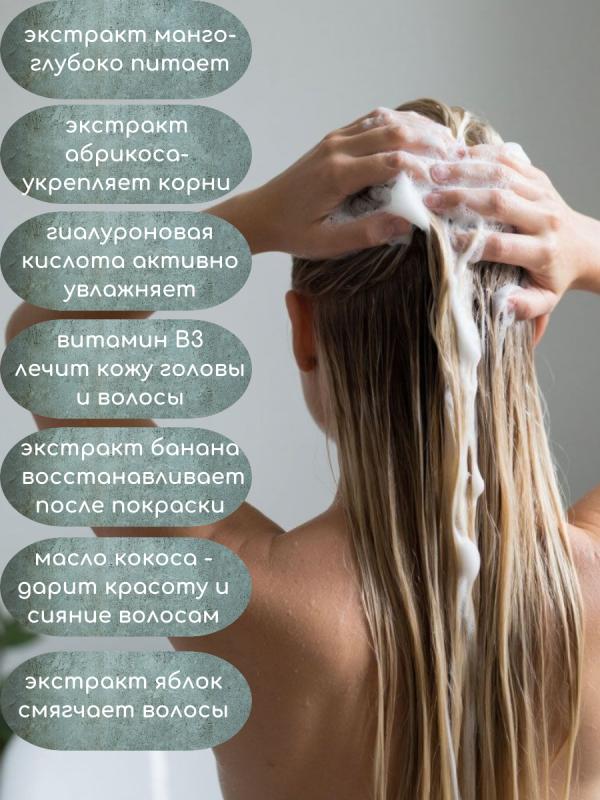 Шампунь для нормальных и сухих волос, увлажняет и питает их по всей длине, придает им мягкость и блеск.Гиалуроновая кислота – ультра увлажнение, сохранение влаги в структуре волоса.Экстракт кокоса – отлично ухаживает за сухими, ослабленными и поврежденными волосами, он улучшает внешний вид, делает их более послушными. Нейтрализует сухость и повреждения волос.Ниацинамид – активизирует спящие волосяные луковицы, что способствует росту волос