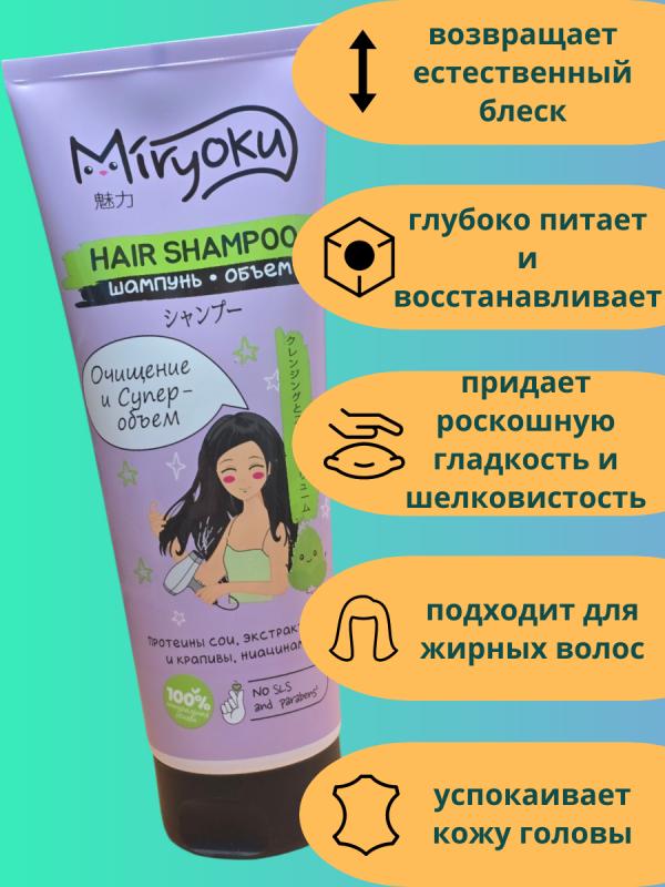 Шампунь MIRYOKU Очищение и Суперобъем, для нормальных и склонных к жирности волос, 250 мл . Шампунь для нормальных и склонных к жирности волос, эффективно очищает волосы и кожу головы, придает свежести и супер объёма. Протеины сои - эффективно восстанавливают структуру поврежденных волос, заполняя пустоты в волосах. Волосы при этом приобретают блеск, прочность и выравнивается их структураЭкстракт мяты - значительно увеличивает толщину каждого волоса и количество волосяных фолликулов. Результат - более густые и послушные пряди.СоставAqua, Sodium Laureth Sulfate, Cocamidopropyl Betaine, Cocamide Diethanolamine, Polyquaternium-7, Bis-Cetearyl Amodimethicone, Ceteareth-7, Ceteareth-25, Silicone Quaternium-18, Trideceth-6, Trideceth-12, Xanthan Gum, Caprylyl Glycol, Hydrolyzed Wheat Protein, Hydrolyzed Soy Protein, Pectin, Proline, Serine, Arginine, Glucose, Butylene Glycol, Chondrus Сrispus (Сarrageenan) Extract, Ethylhexylglycerin, Extract Hippophaes rhamnoides, Extract Juniperus communis, Extract Rosa majalis,