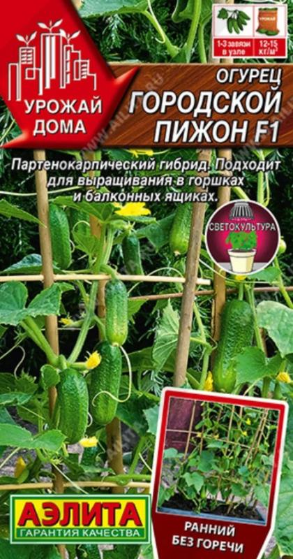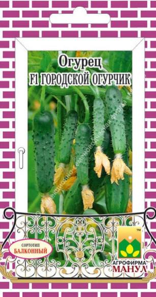 F1 Городской огурчик - партенокарпический суперпучковый корнишон сортотипа Балконный с некрупными листьями, короткими междоузлиями и большим количеством завязей и зеленцов на растении для лоджий, балконов, веранд, открытого и защищенного грунта. Наибольшие урожаи получают в теплицах, где растения вырастают мощными, с крупными суперпучками. Ветвление активное. Вступает в плодоношение на 40-41 день от всходов. Зеленцы бугорчатые, белошипые (частота расположения бугорков средняя), длиной 9-12 см, диаметром 2,1-2,7 см, массой 75-90 см, на длинной плодоножке. Зеленцы долго не перерастают