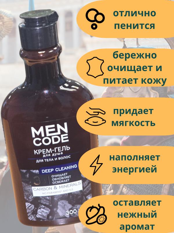 Крем‑гель для душа Men Code 3 в 1: Deep CleaningМощный уход в одном флаконе — крем‑гель Men Code сочетает глубокую очистку тела и волос с заботой о коже. Формула с углеродом и минералами работает по трём направлениям: очищает, обновляет, освежает — и делает это бережно, без агрессивных компонентов.Почему стоит выбрать Men Code?Это не просто средство для мытья — это комплексный уход для современного мужчины:экономит время: 3 в 1 (тело + волосы + очищение)