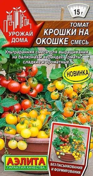 Смесь из лучших ультраранних сортов томата для выращивания на подоконниках, балконах, верандах. В смесь входят сорта: Детки-конфетки (оранжевые плоды), Монетка (желтые плоды) и Пиноккио (красные плоды). Растения компактные, высотой 15-20 см, во время плодоношения покрыты множеством миниатюрных плодов, придающих кустику особенно декоративный вид. Урожай созревает через 85-95 дней после всходов. Помидоры округлые, гладкие, массой 10-15 г, сладкие, ароматные. Прекрасно подходят для употребления в свежем виде, домашней кулинарии и консервирования. Данные сорта отлично растут также и в открытом грунте. Выращиваются без пасынкования.