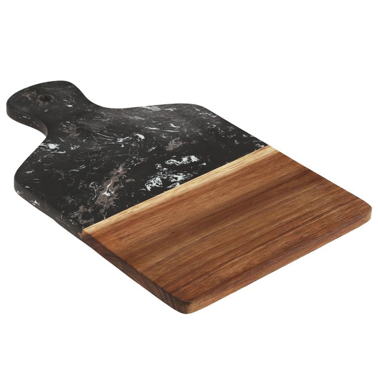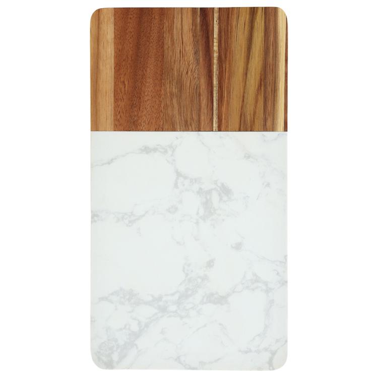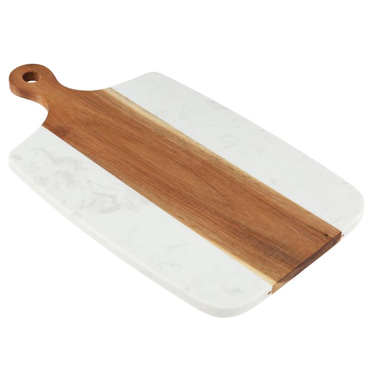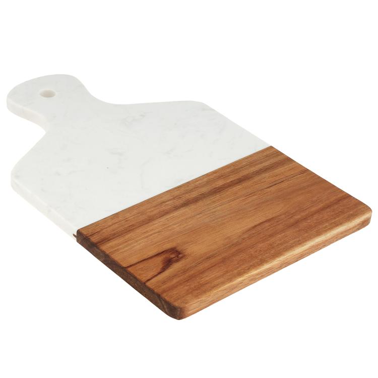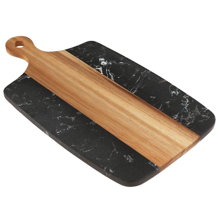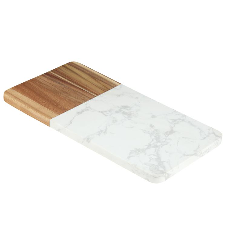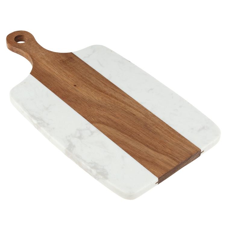 Разделочная доска с мраморной и деревянной частью применяется для нарезки продуктов (сыра, овощей, фруктов, мяса) и красивой сервировки закусок, нарезок или десертов на столе.