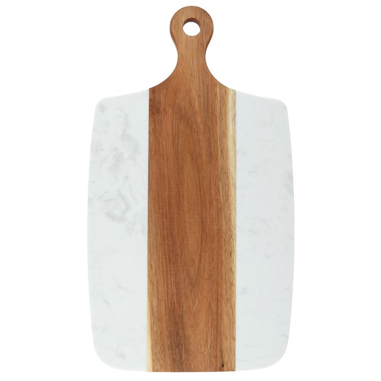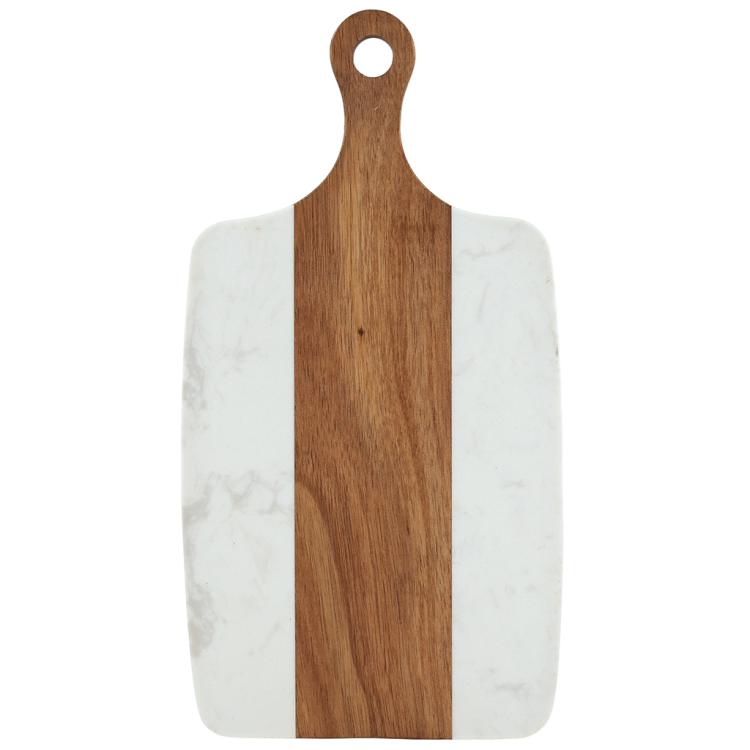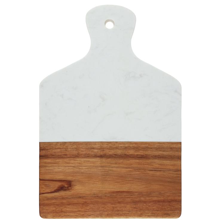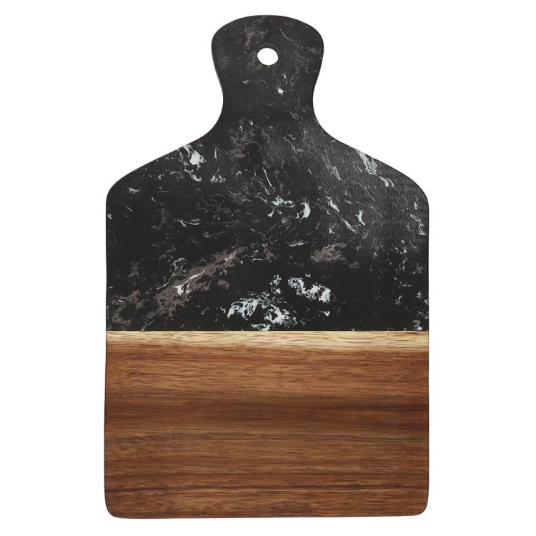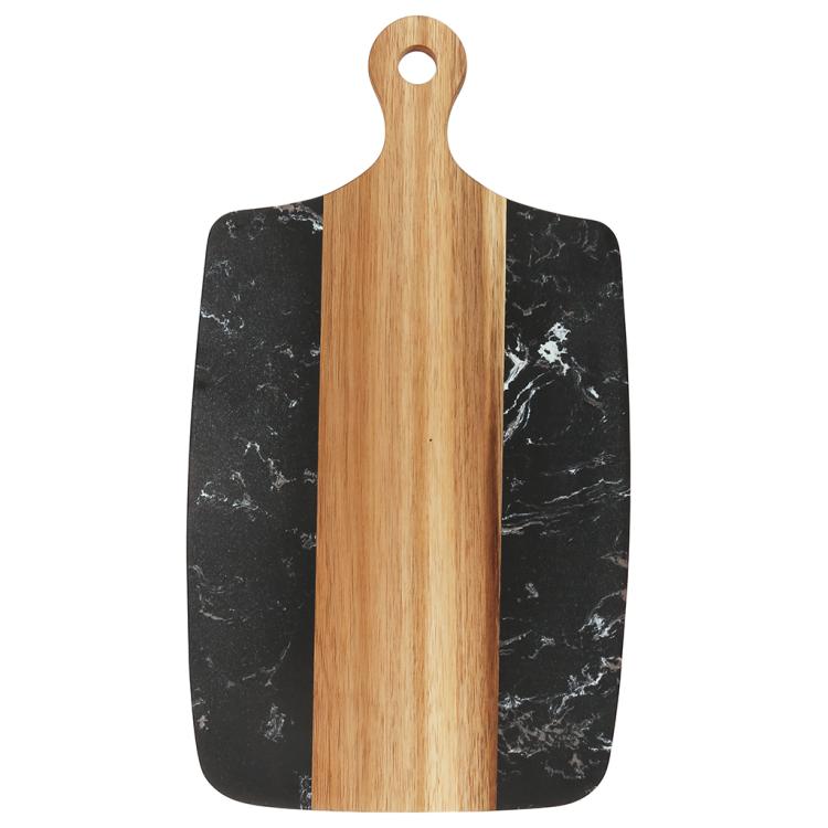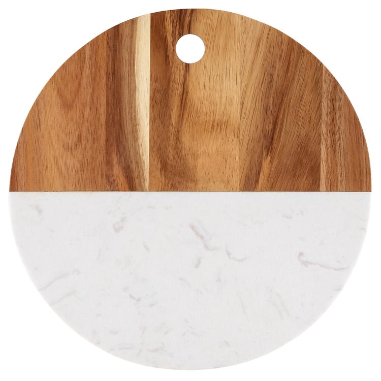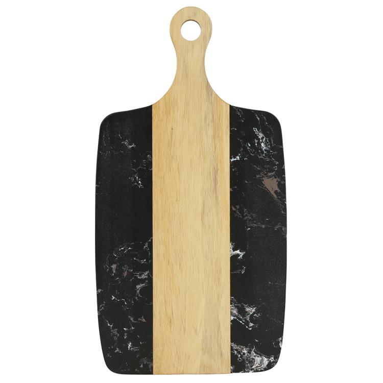 Разделочная доска с мраморной и деревянной частью применяется для нарезки продуктов (сыра, овощей, фруктов, мяса) и красивой сервировки закусок, нарезок или десертов на столе.