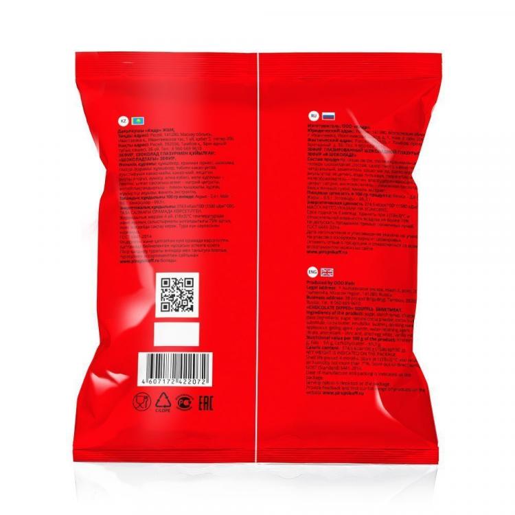 Состав Сахар-песок, патока крахмальная, глазурь шоколадная (состав: сахар-песок, какао-порошок натуральный, заменитель какао-масла, какао-масло, эмульгатор лецитин), вода питьевая, пюре яблочное, желеобразователь – пектин, влагоудерживающий агент – цитрат натрия, антиокислитель – лимонная кислота, белок яичный сухой, сок фруктовый апельсиновый, краситель аннато, ароматизатор натуральный «Апельсин».