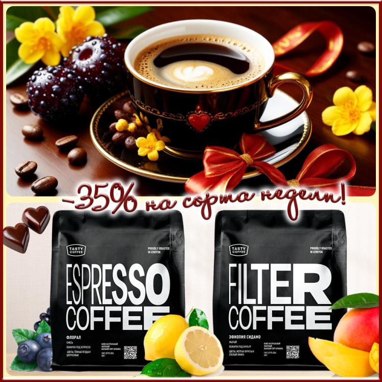 ☕️ -35% НА ОЧЕНЬ ВКУСНЫЕ СОРТА НЕДЕЛИ ДО 20 ФЕВРАЛЯ! №1 ФЛОРАЛ Лёгкий эспрессо-бленд с нотами цветов, тёмных ягод и цитрусовых! №2 ЭФИОПИЯ СИДАМО Это лёгкий кофе с нотами цветов, жёлтых фруктов и спелого лимона!