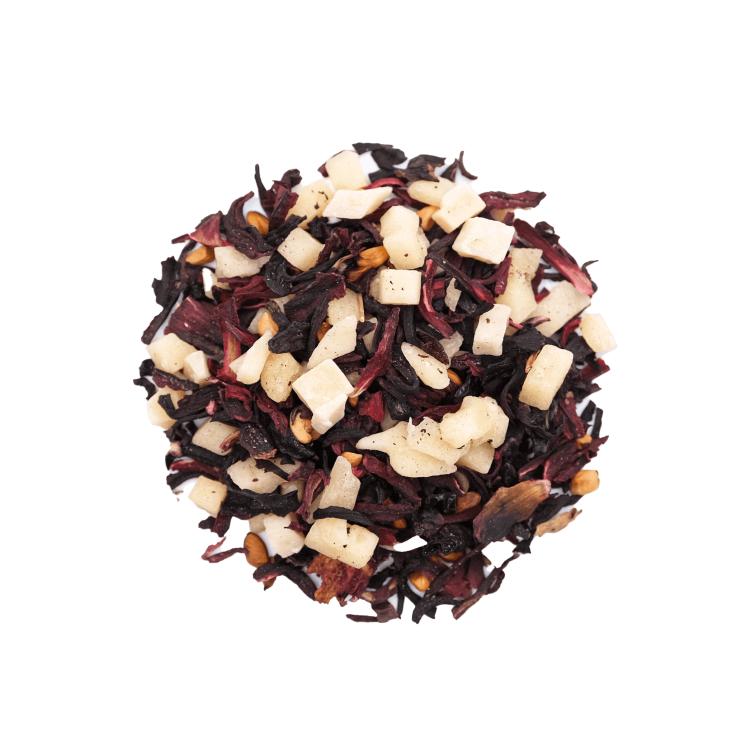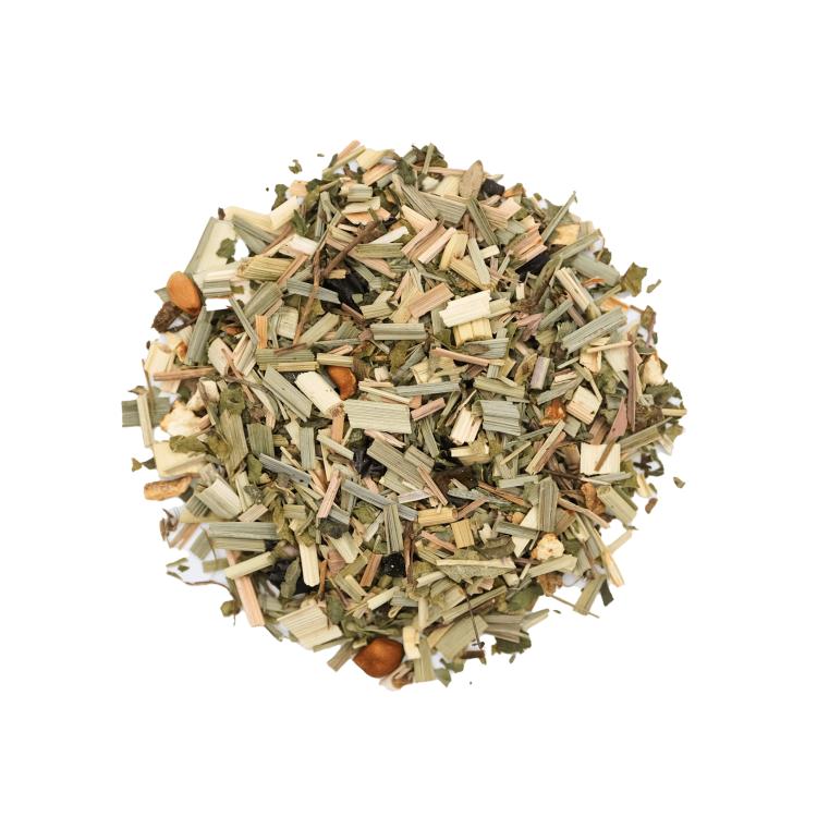 Тизаны — это напитки, приготовленные из трав, фруктов, коры, цветов или специй, но без добавления чайного листа. В составе этого тизана — имбирь, лемонграсс, ромашка, яблоко, чёрный перец, лепестки розы, сладкий корень, кусочки и цедра лимона, корица, мята.