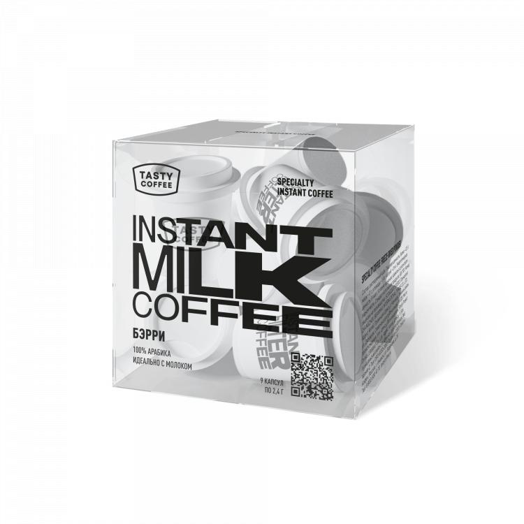 В этих маленьких стаканчиках — растворимый спешелти кофе. Это продукт, к запуску которого мы долго готовились, выбирали сырьё и технологию производства. В основе этого растворимого кофе смесь Бэрри — плотный кофе с нотами ореховой пасты, тёмных ягод и печенья.