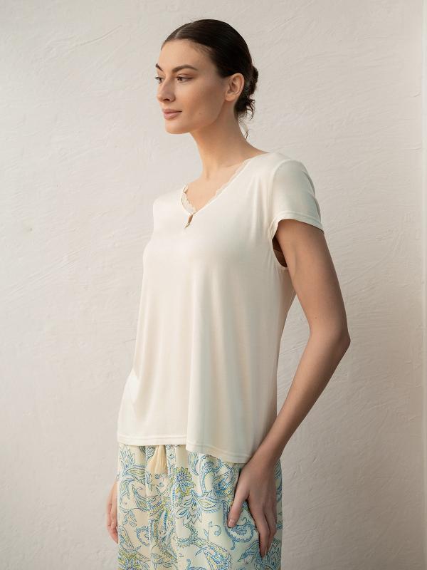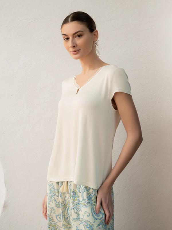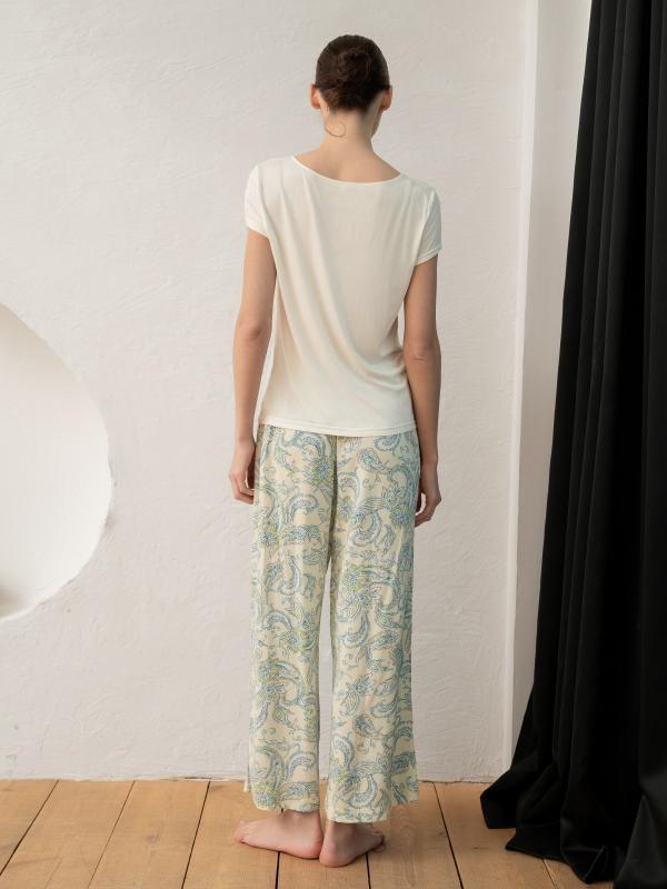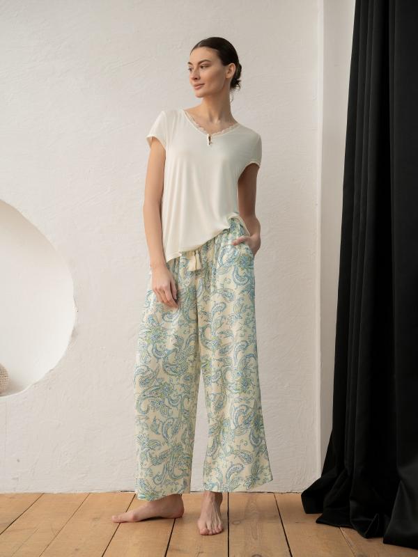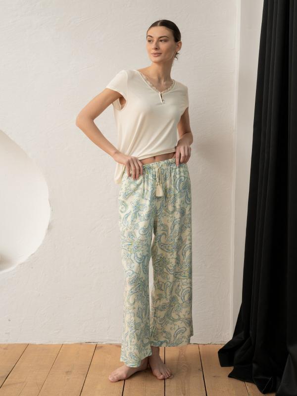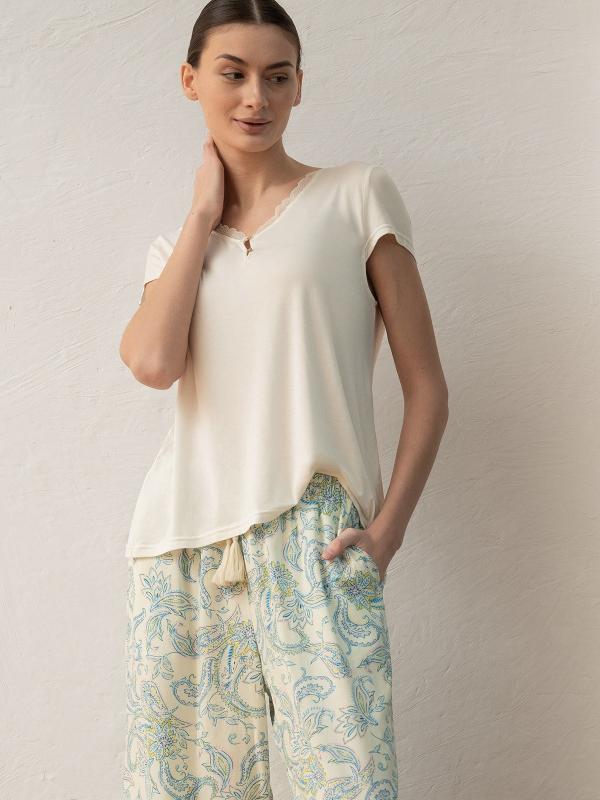 Пижама женская состоит из футболки и брюк. Футболка прямого свободного кроя изготовлена из бамбукового трикотажа и выполнена в классическом белом цвете. Имеет короткие рукава и V-образный вырез в зоне декольте, обрамленный кружевом, застёгивающийся на две пуговицы. Брюки прямого свободного кроя изготовлены из вискозной ткани, имеют мягкую тянущуюся резинку на талии с регулирующим шнурком. Брюки дополнены боковыми карманами и украшены цветочным принтом.