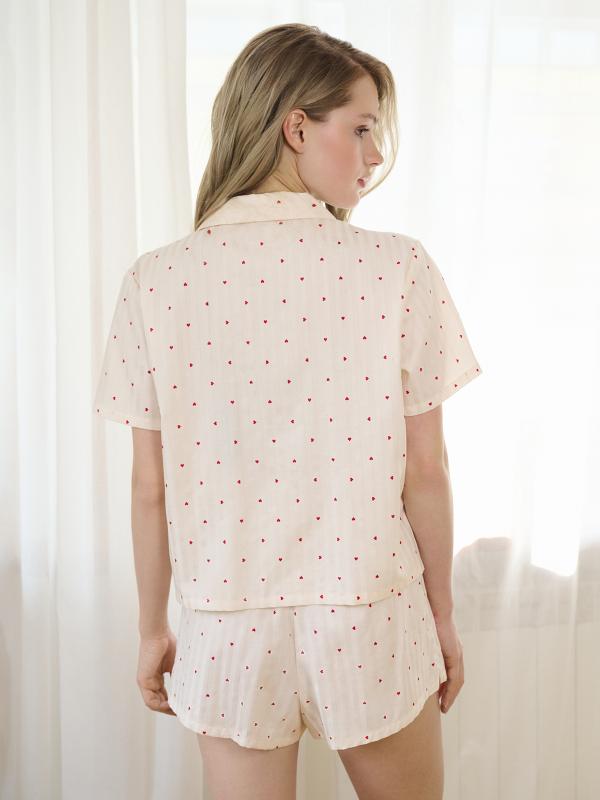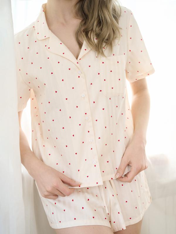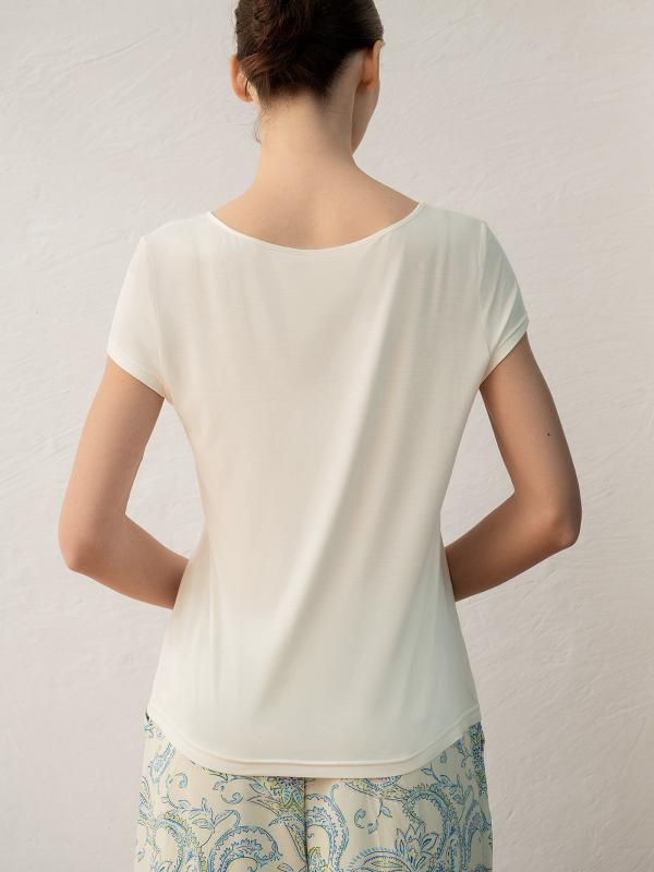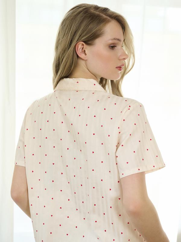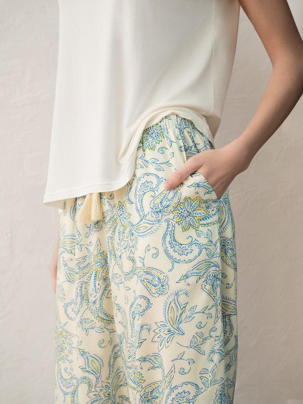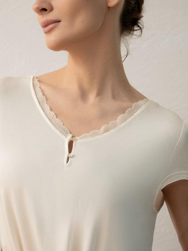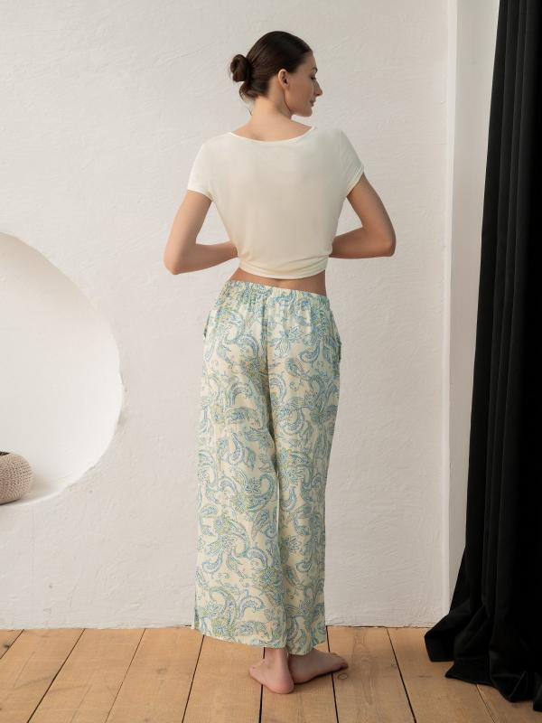 Пижама женская состоит из футболки и брюк. Футболка прямого свободного кроя изготовлена из бамбукового трикотажа и выполнена в классическом белом цвете. Имеет короткие рукава и V-образный вырез в зоне декольте, обрамленный кружевом, застёгивающийся на две пуговицы. Брюки прямого свободного кроя изготовлены из вискозной ткани, имеют мягкую тянущуюся резинку на талии с регулирующим шнурком. Брюки дополнены боковыми карманами и украшены цветочным принтом.