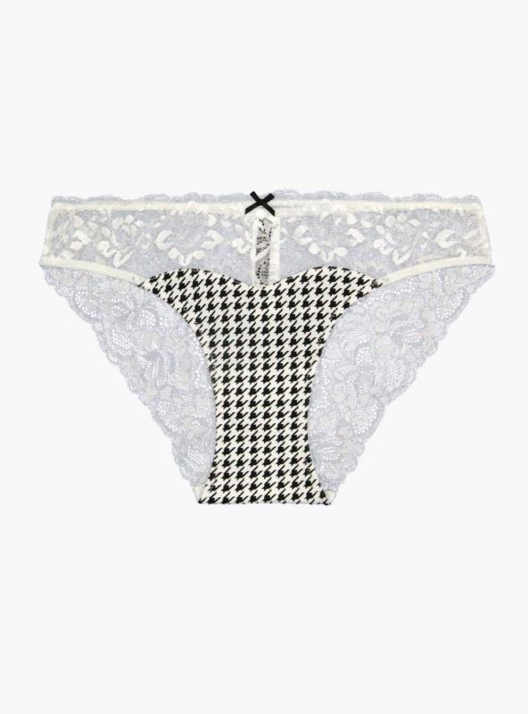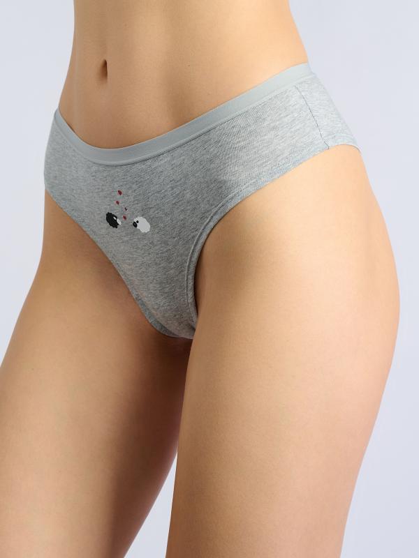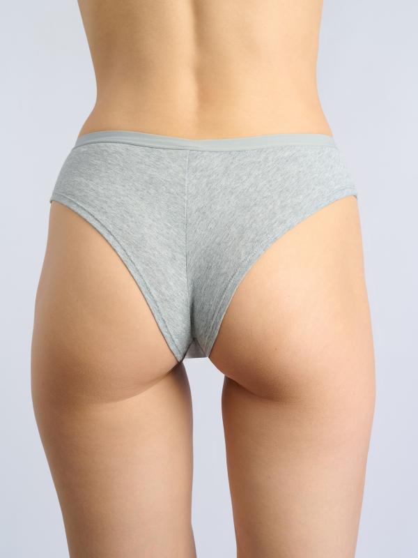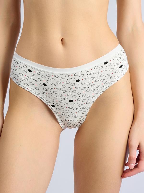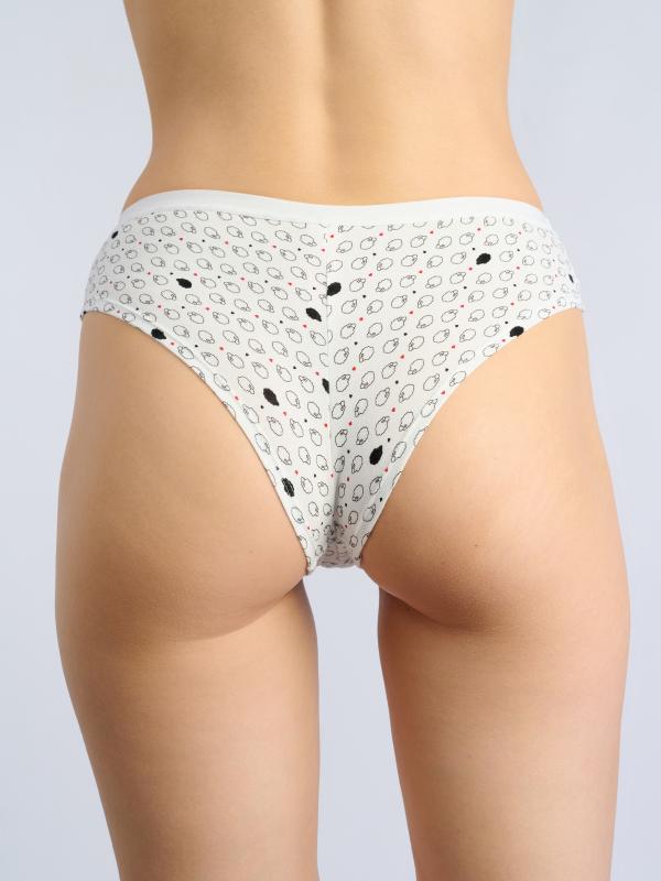 Набор включает трое трусов слипов женских, изготовленных из хлопка и выполненных в белом, бежевом и черном цветах. Трусы имеют среднюю посадку и мягкую резинку на талии, их украшением является принт с изображением пуговиц спереди.