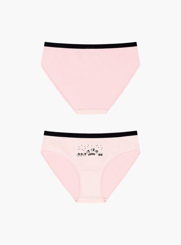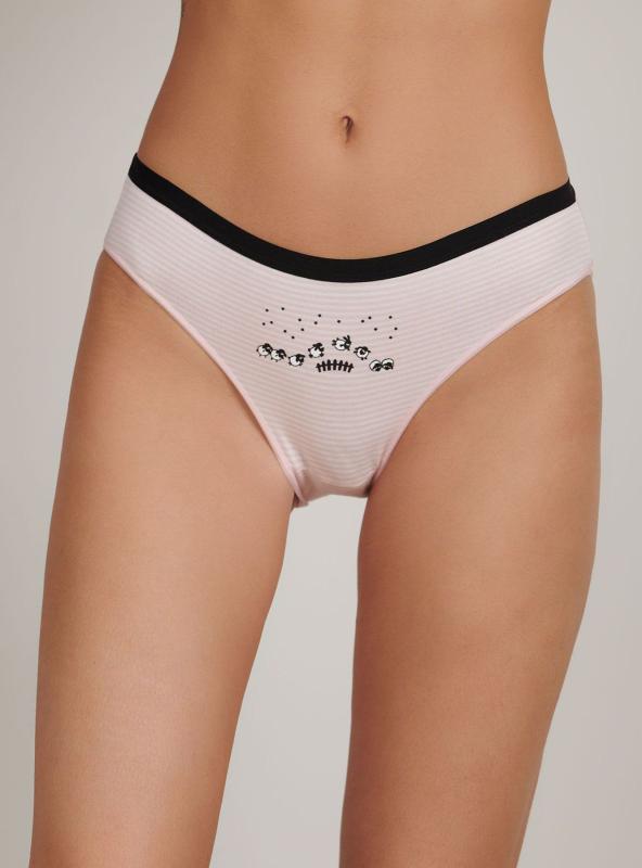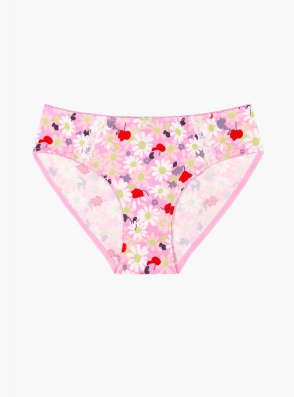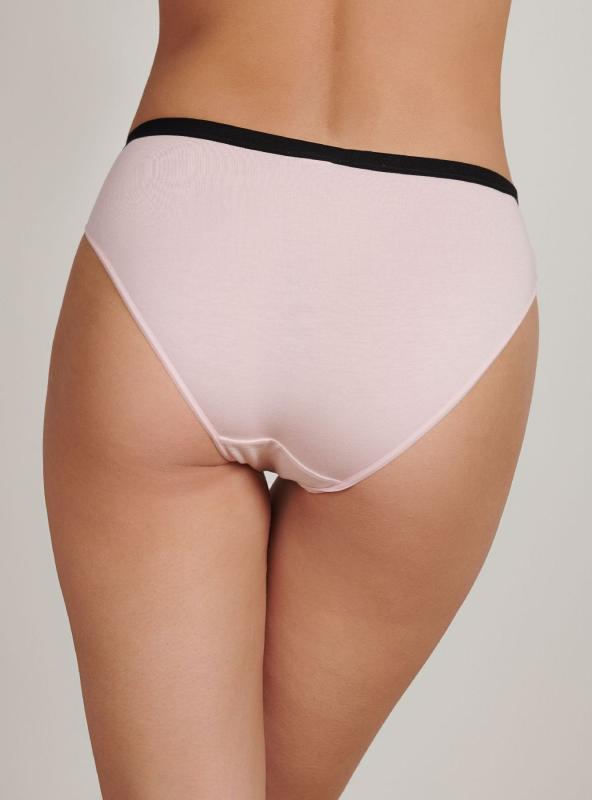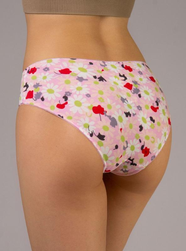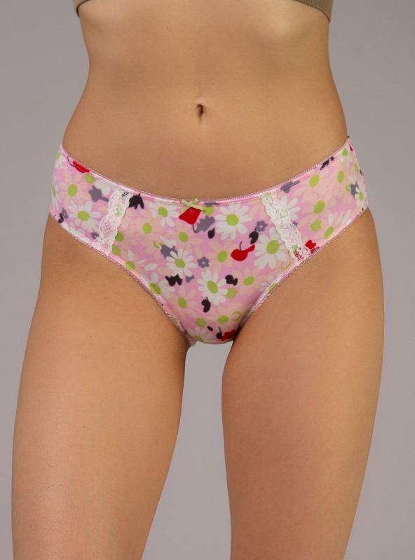 Модель средней посадки держится на мягкой эластичной резинке контрастного персикового цвета, украшенной небольшой декоративной розочкой.