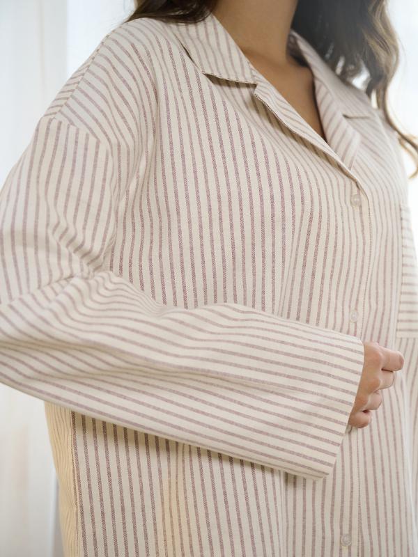 В комплект входит рубашка и брюки в нежную вертикальную полоску.