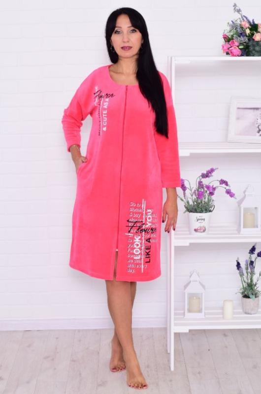 Велюровый халат свободного кроя со спущенной проймой, двумя боковыми карманами, горловина круглая, рукав длина 7-8. Халат застегивается на застежку-молнию. На полочке оригинальные принты. Длина халата: 46-100 см, 48-101 см, 50-102 см, 52-103 см, 54-104 см, 56-105 см, 58-106 мс, 60-107 см. Длина рукава: 46-39 см, 48-39 см, 50-38 см, 52-38 см, 54-37 см, 56-37 см, 58-36 см, 60-36 см.