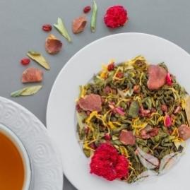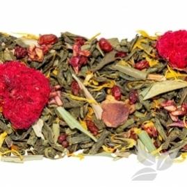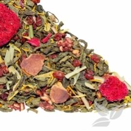 Смесь разных сортов зеленого чая с ягодами брусники и вишни, шиповником, листьями тархуна, цветками тибетской ромашки и лепестками календулы. Настой светло-зеленого цвета с интересным свежим вкусом и ароматом.