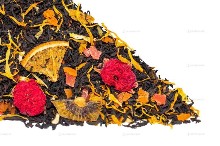 Черный индийский чай с добавлением кусочков арбуза, моркови, ягод малины, кожуры и кусочков ананаса, сахарного конфетти. Настой темно-коричневого цвета с ярким сладковатым вкусом. Способствует укреплению иммунитета.