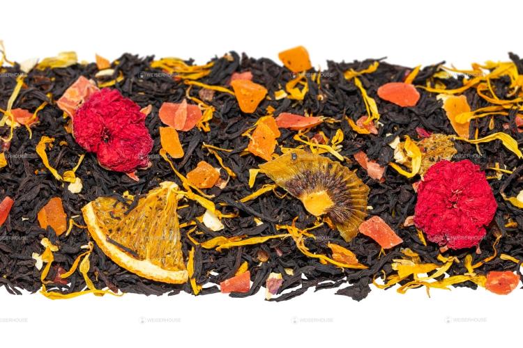 Индийский черный чай с кусочками папайи и манго, дольками киви и банана, цветками апельсинового дерева, лепестками розы и календулы. Прекрасное сочетание нежности и бархатистости во вкусе и аромате. В зимнее время года настой улучшает настроение, успешно борется с усталостью, а в летние дни утоляет жажду и дарит множество ярких ощущений.