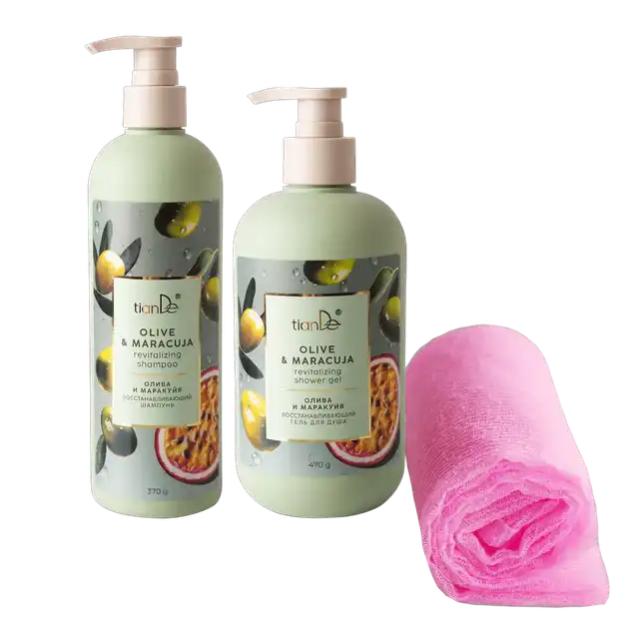Сочная маракуйя и оживляющая олива – ощути качественный восстанавливающий уход с ценными компонентами! Шампунь мягко очищает, придает волосам блеск и силу. Гель для душа окутывает тело нежной пеной, дарит ощущение свежести и комфорта. Бонусом к набору «Олива и маракуйя» забирай метровую мочалку-полотенце, которая обеспечивает не только качественное очищение, но и бережный пилинг и массажный эффект.