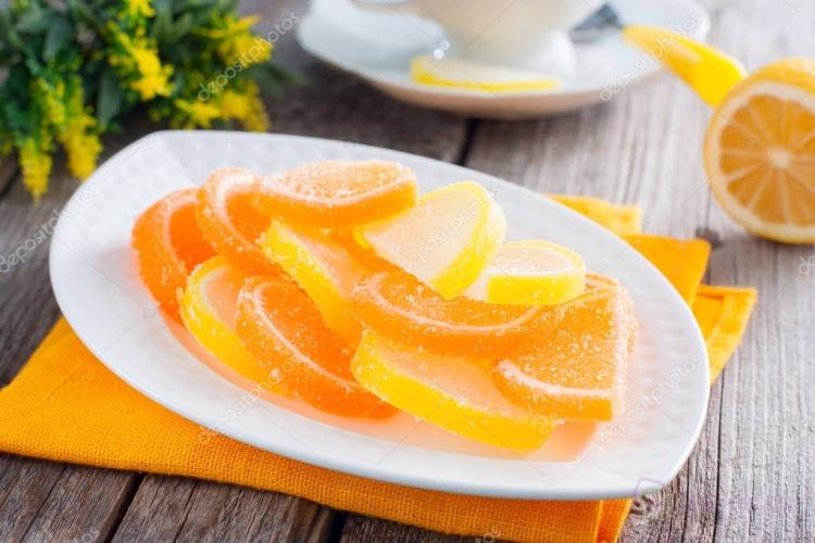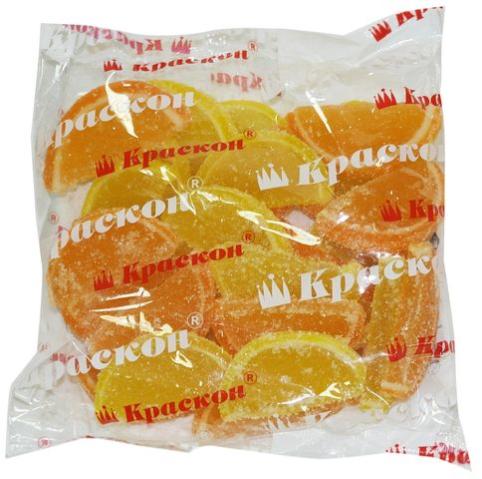 Желейный резной мармелад в виде долек обсыпанные сахаром-песком. Имеет кисло-сладкий вкус и явно выраженный аромат апельсина и лимона.