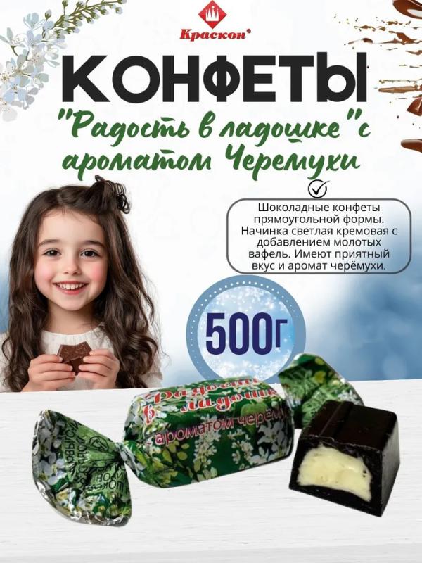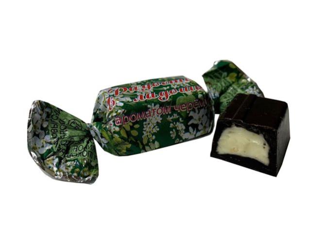 Шоколадные конфеты прямоугольной формы. Начинка светлая кремовая с добавлением молотых вафель. Имеют приятный вкус и аромат черёмухи.