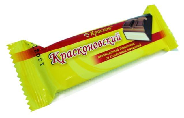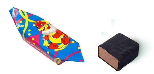 Глазированные шоколадной глазурью конфеты продолговатой прямоугольной формы. Корпус состоит из двух слоёв: молочно-ликёрного и молочно-помадного.
