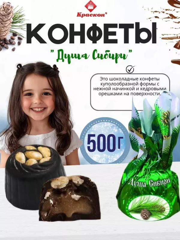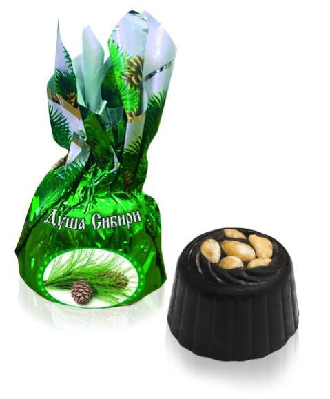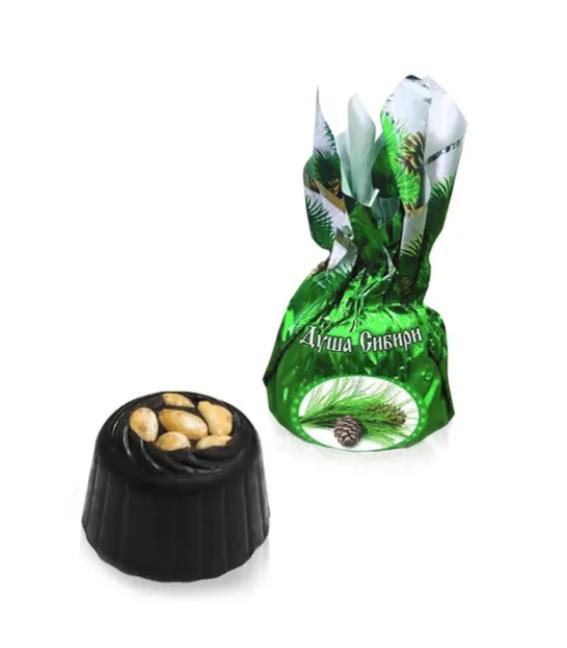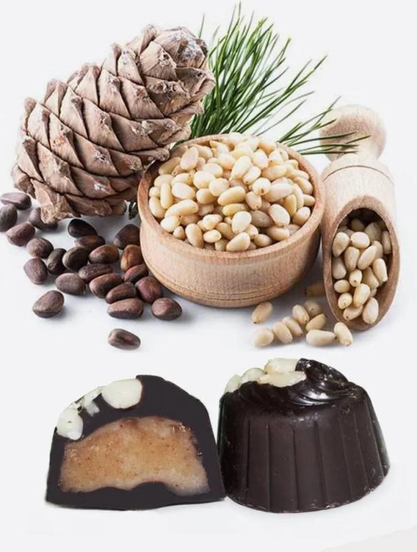 Это шоколадные конфеты куполообразной формы с нежной начинкой и кедровыми орешками на поверхности.