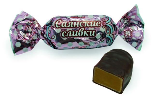 Глазированные натуральной шоколадной глазурью конфеты, которые отличаются от других своим не очень сладким приятным молочным вкусом со слегка упругой жевательной консистенцией. Данные конфеты являются менее калорийными вследствие уменьшенного (меньше в 2 раза по сравнению с классическими конфетами) содержания сахара, большого содержания молока и пшеничных волокон. Конфеты «Саянские сливки» выпускаются по новой нетрадиционной технологии и эксклюзивной фирменной рецептуре. Имеют тонкий вкус и аромат сливочного пломбира.