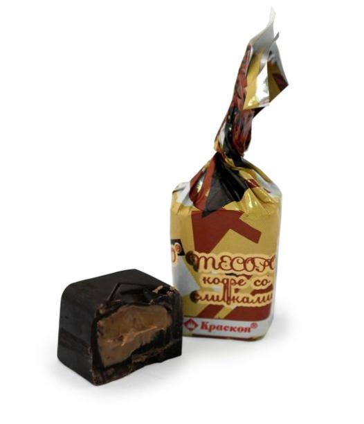 Формовые конфеты небольшой прямоугольной формы. Начинка изготовлена с добавлением натурального молотого кофе.