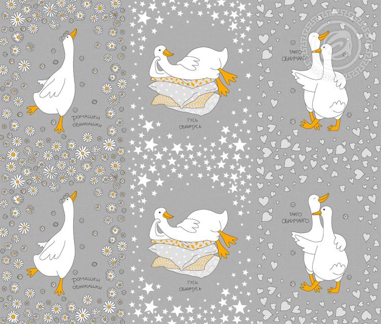Персонажи «гуси» стали очень популярны. И это не случайно. Они являются символом заботы, помогая справиться со стрессом и одиночеством. И в нашей коллекции также появилась ткань с принтом гуси, который дарит исключительно положительные эмоции. На рогожке «Обниманго» забавные и романтичные картины. Один из гусей отдыхает на подушках, другой порхает по ромашковому полю, а влюбленная парочка грациозно танцует танго. Уникальный дизайн полон стиля и элегантности. И при этом он очень яркий и эффектный. Изделия из рогожки с гусями преобразят интерьер.