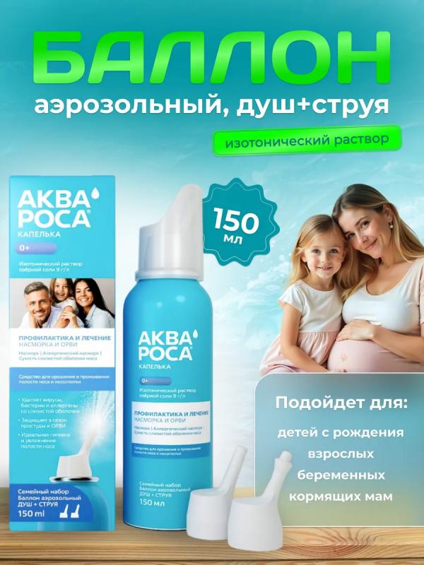 Набор для всей семьи АКВАРОСА КАПЕЛЬКА – это средство для орошения и промывания полости носа и носоглотки для детей с 1-го года, взрослых, беременных и кормящих мам.