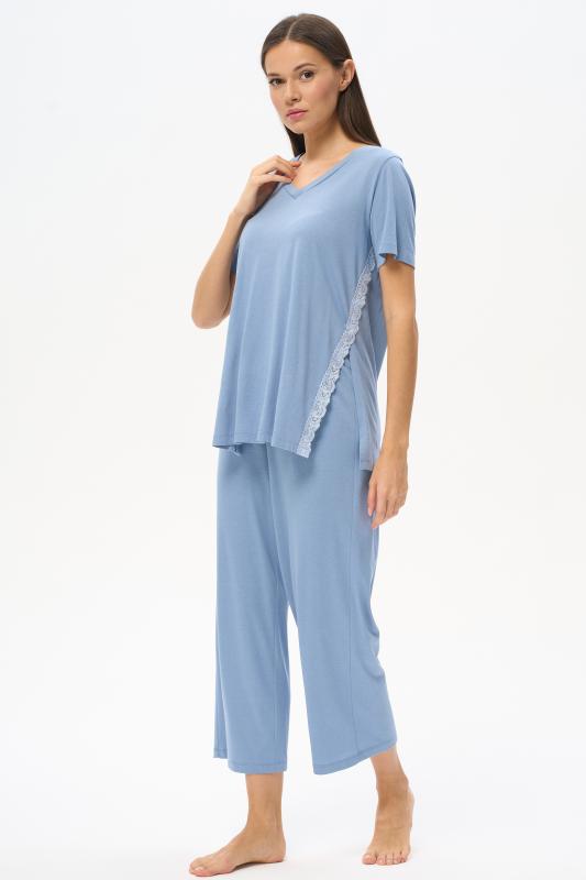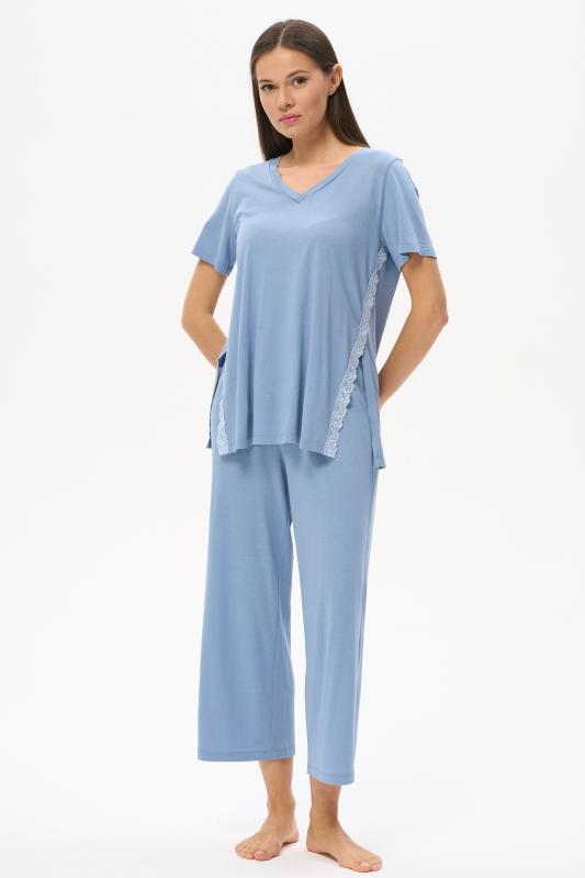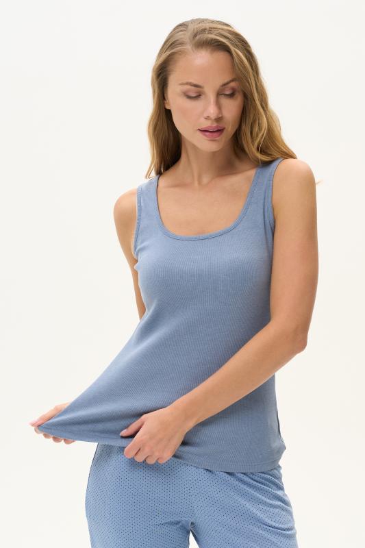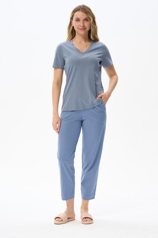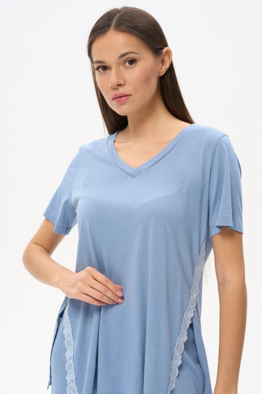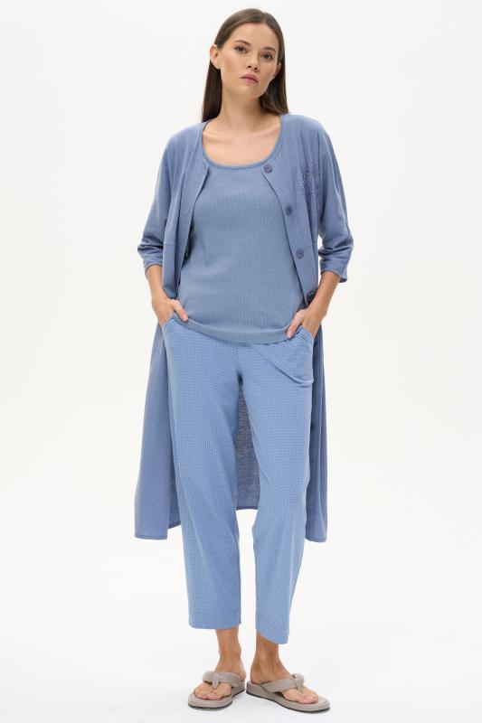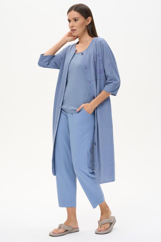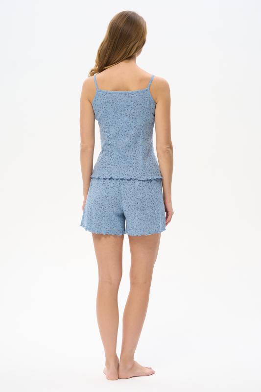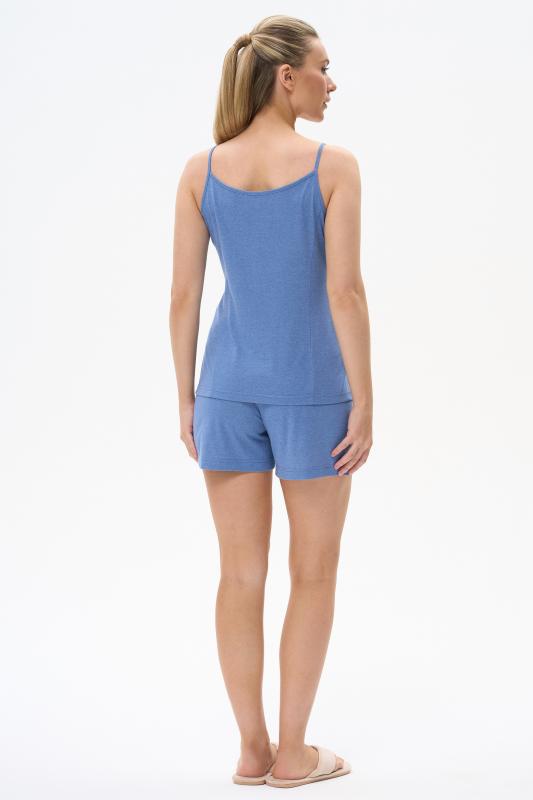 Комплект выполнен из хлопкового меланжевого полотна. Майка с круглым вырезом горловины. Спереди подрез и средний шов декорирован мережкой. Шорты без карманов, пояс с эластичной лентой внутри. Боковые швы шорт декорированы мережкой. Рост модели на фото 178см.